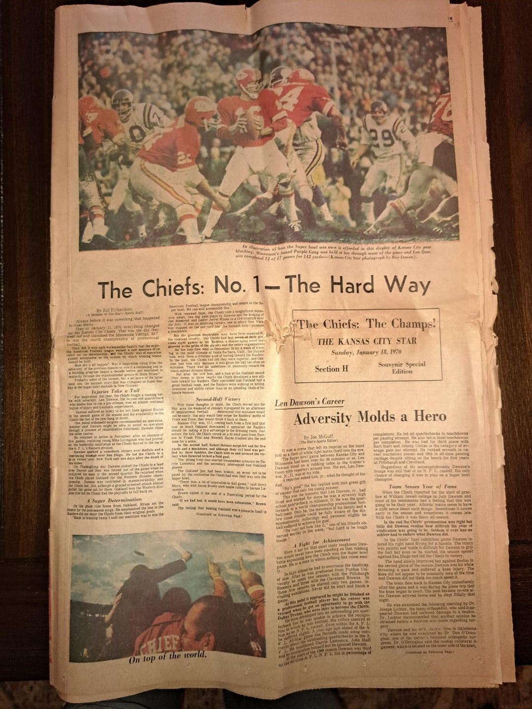 In the first half against Minnesota, the Chiefs’ defense and kicker Jan Stenerud gave them a 9–0 lead, and by the time Dawson hit Otis Taylor for the clinching 46-yard touchdown pass in the third quarter, the game was all but over.