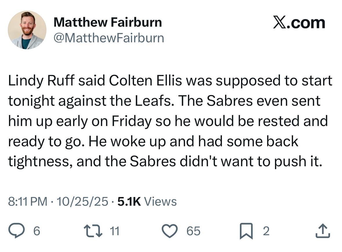 [Fairburn] Lindy Ruff said Colten Ellis was supposed to start tonight against the Leafs. The Sabres even sent him up early on Friday so he would be rested and ready to go. He woke up and had some back tightness, and the Sabres didn’t want to push it.