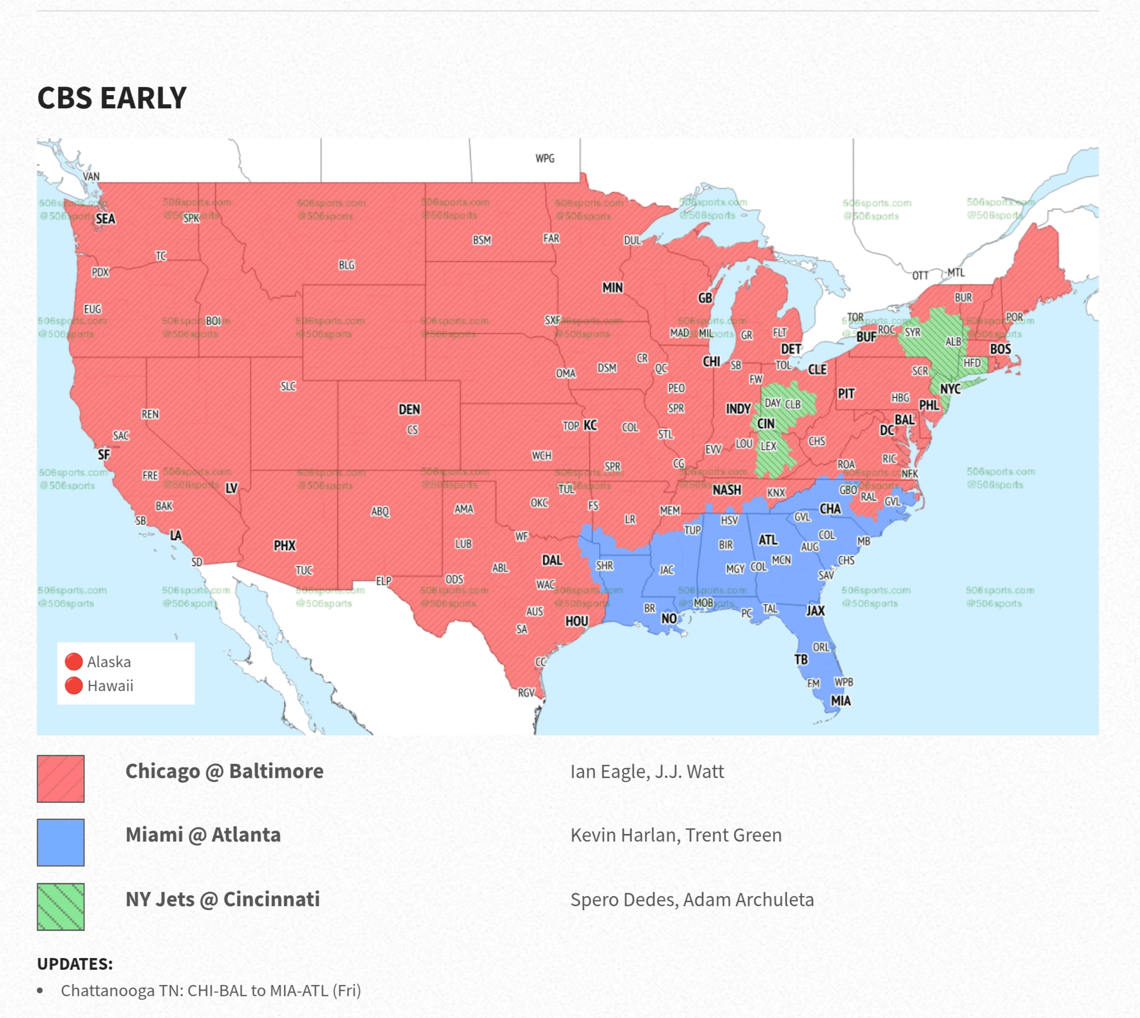 Courtesy: 506Sports. Map is as of this post date, and coverage is subject to change on Gameday. 22 comments No one wants to watch the jets rn lol Pretty rough slate of early games for CBS. Lol This is one of the funnier broadcast maps I’ve seen. Booooo that’s lame I’m sure the map was decided when Lamar was still “active” [deleted] With Lamar out this really is a shitty slate of games. oh fuck these guys, can’t even watch the game in joe burrows hometown again. To the seas I go Don’t understand why the Charleston market (SE Ohio) wouldn’t get the bengals. I’m right here in Louisville damnit Da Bears Another win for Sunday Ticket Student 🙌🏾 At least we don’t have to listen to Nantz and Romo! Same number of people in red and green… Man, imagine watching Falcons vs Dolphins. thought all of Kentucky would be Bengals country As a CLE-based Bengals fan this pisses me off. I’m sure it’s economically/demographically best or whatever, but damn. These broadcast maps are so stupid. Folks should be able to watch any game they want. We all have to suffer through the commercials. I will be sailing the seas watching this one. ARRRRRR ME MATEY!!! Redzone it is. Just like almost every other week down here in Alabama. Dang it we don’t get Harlan on commentary. I woulda been fucking pissed if we got blacked out Leave a ReplyYou must be logged in to post a comment.