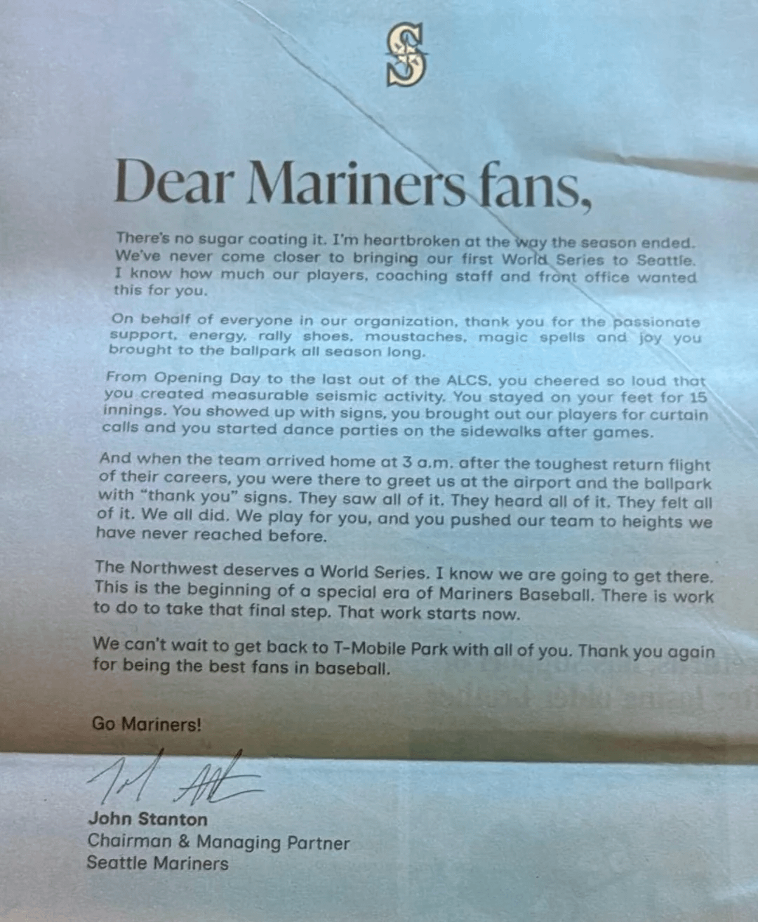 Full page ad in the Seattle Times from Mariners chairman John Stanton