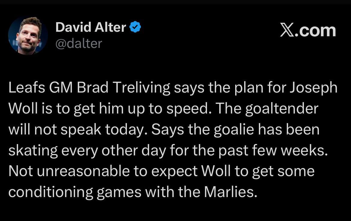 [Alter] Leafs GM Brad Treliving says the plan for Joseph Woll is to get him up to speed. The goaltender will not speak today. Says the goalie has been skating every other day for the past few weeks. Not unreasonable to expect Woll to get some conditioning games with the Marlies.