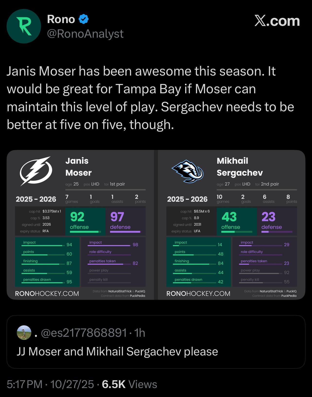 You guys gotta stop cherry picking stats against Sergachev. They’re different players. Moser is more defensively focused, and Sergachev more offensively focused. That completely changes their stats for the same reason Hedman and Kuch are always at the top of our giveaway numbers.