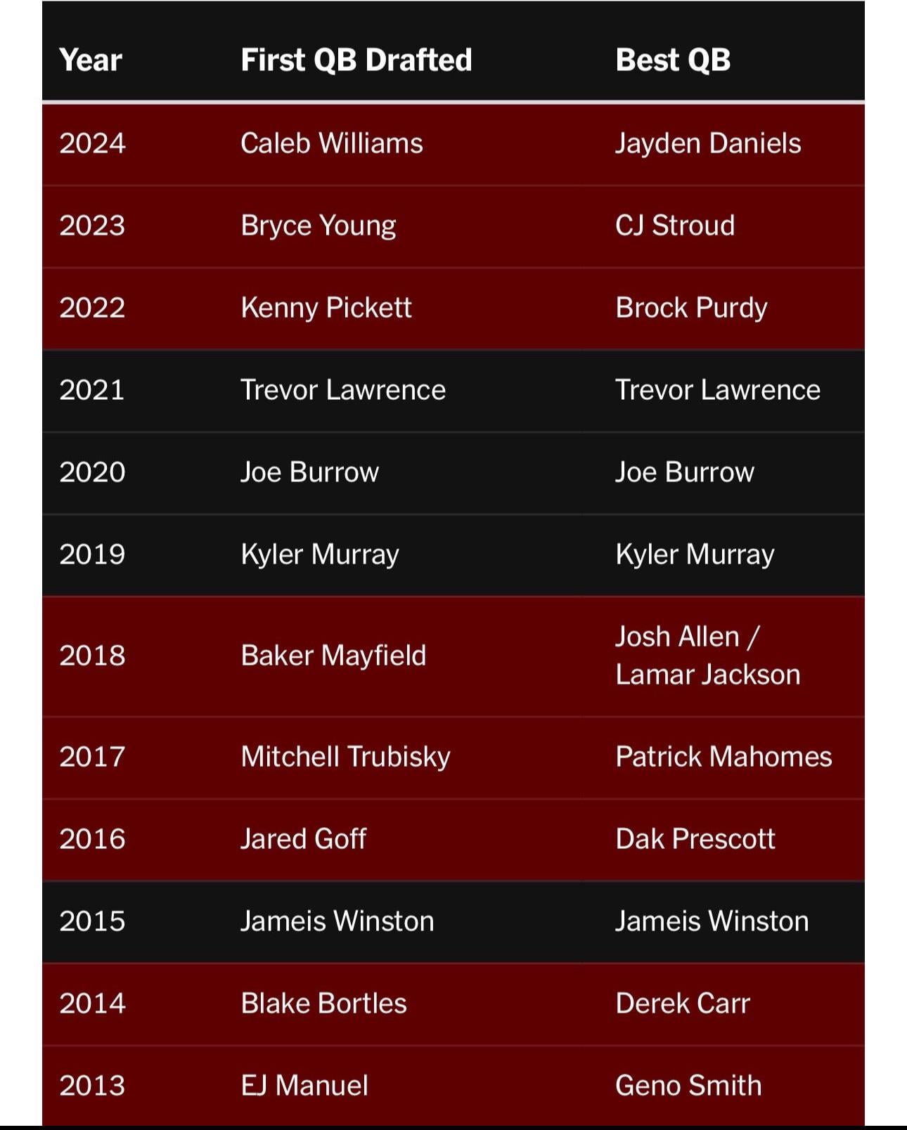 This post is actually brain dead. On average, about 12 QBs are taken in each draft. According to this chart, the best QB of the draft was also the first QB off the board in 4 of the last 12 drafts. Mind you, the moron who made this thinks that Dak is better than Goff, which he most certainly is not. They also have Stroud as better than Young and Jayden as better than Caleb, both of which are far too early to call and highly debatable. The list also **very** conveniently cuts off at 2013 because just before that there was a string of like five straight years of the best QB also being the first QB drafted.