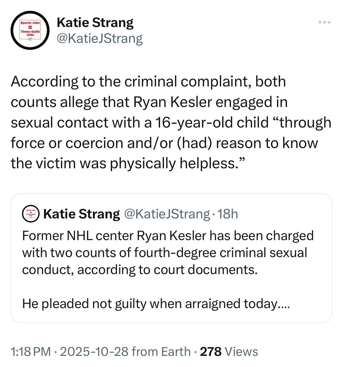 I used to be a huge fan of Kesler but after hearing things + his open MAGA support I stopped being a fan of his a long time ago. I didn’t think he could get worse but clearly I was wrong. I hope the victim has a strong support system.