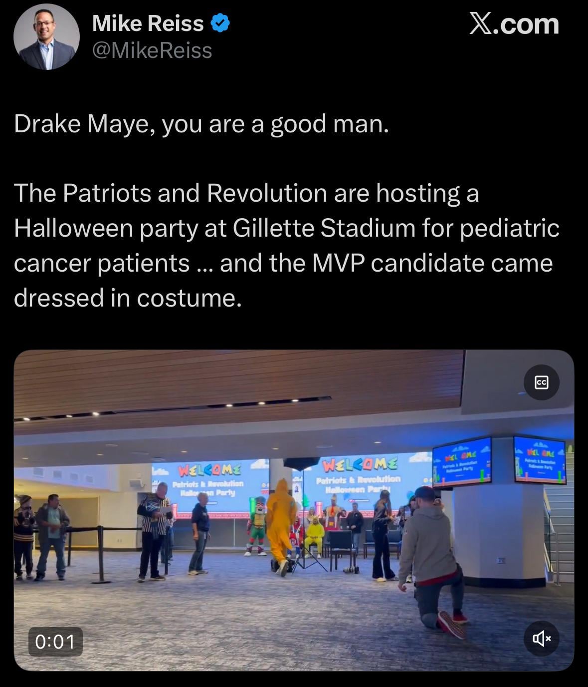 Drake Maye dressed up as the Pokémon Dragonite for the Halloween Party at Gillette Stadium for pediatric cancer patients