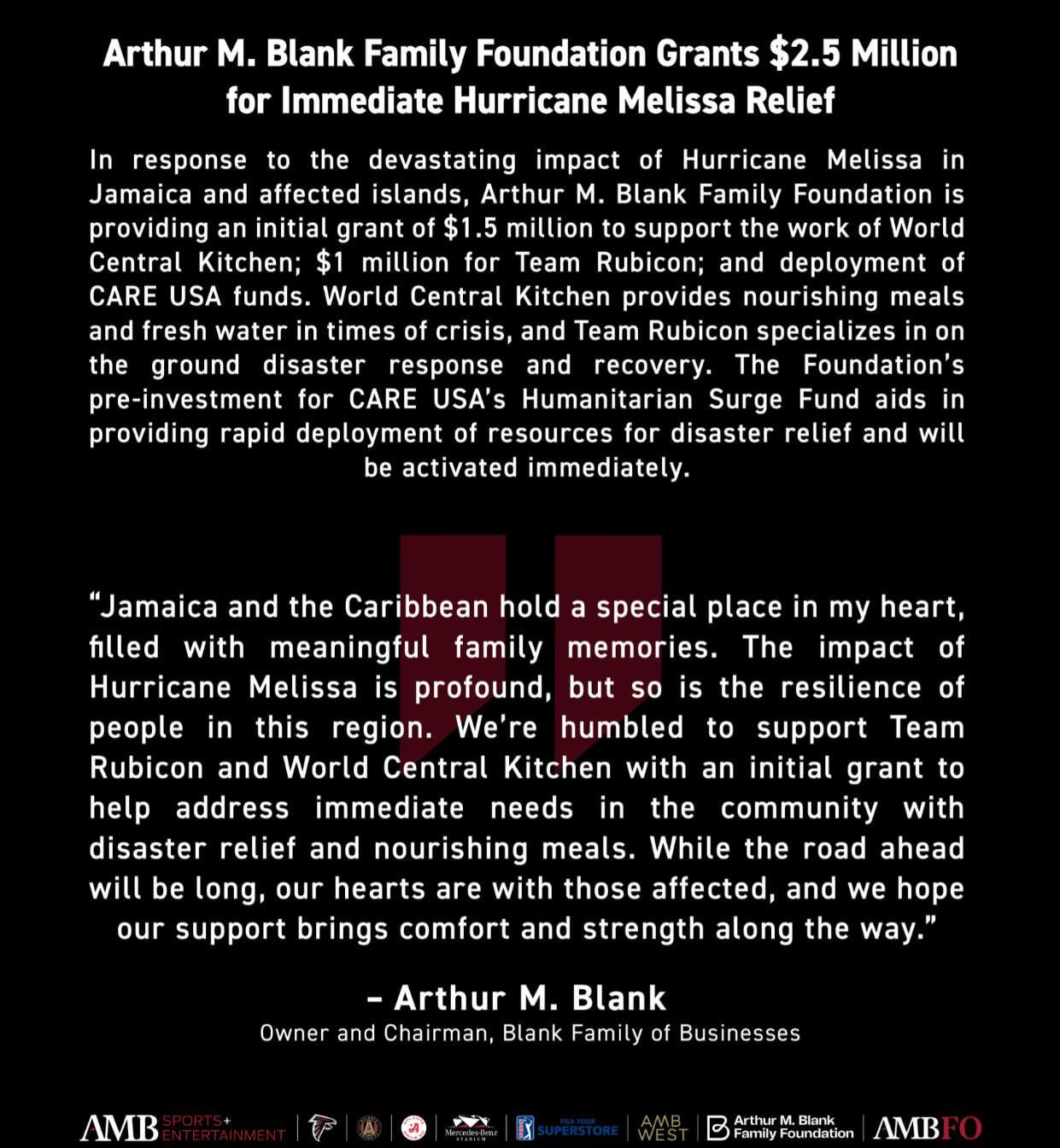 Arthur M. Blank Family Foundation Grants $2.5 Million for Immediate Hurricane Melissa Relief