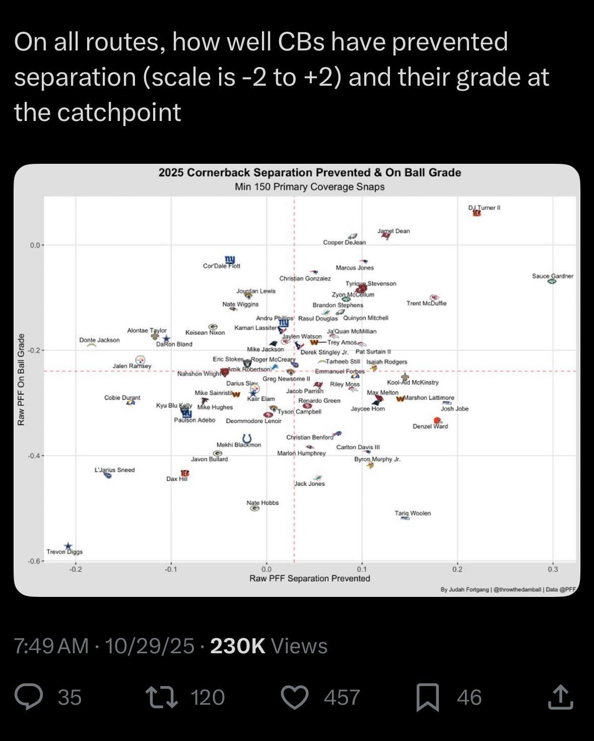 DJ Turner is having an all pro season. He showed flashes his rookie year (think back to the MNF game against the Jags in 2023). He balled out last year until he got hurt. He is now arguably the best Corner in the entire NFL at this moment or is at the very worst top 5. He plays with heart, and dear god is this kid fast. Oh, and a name like JuanDrago Turner II is just badass.