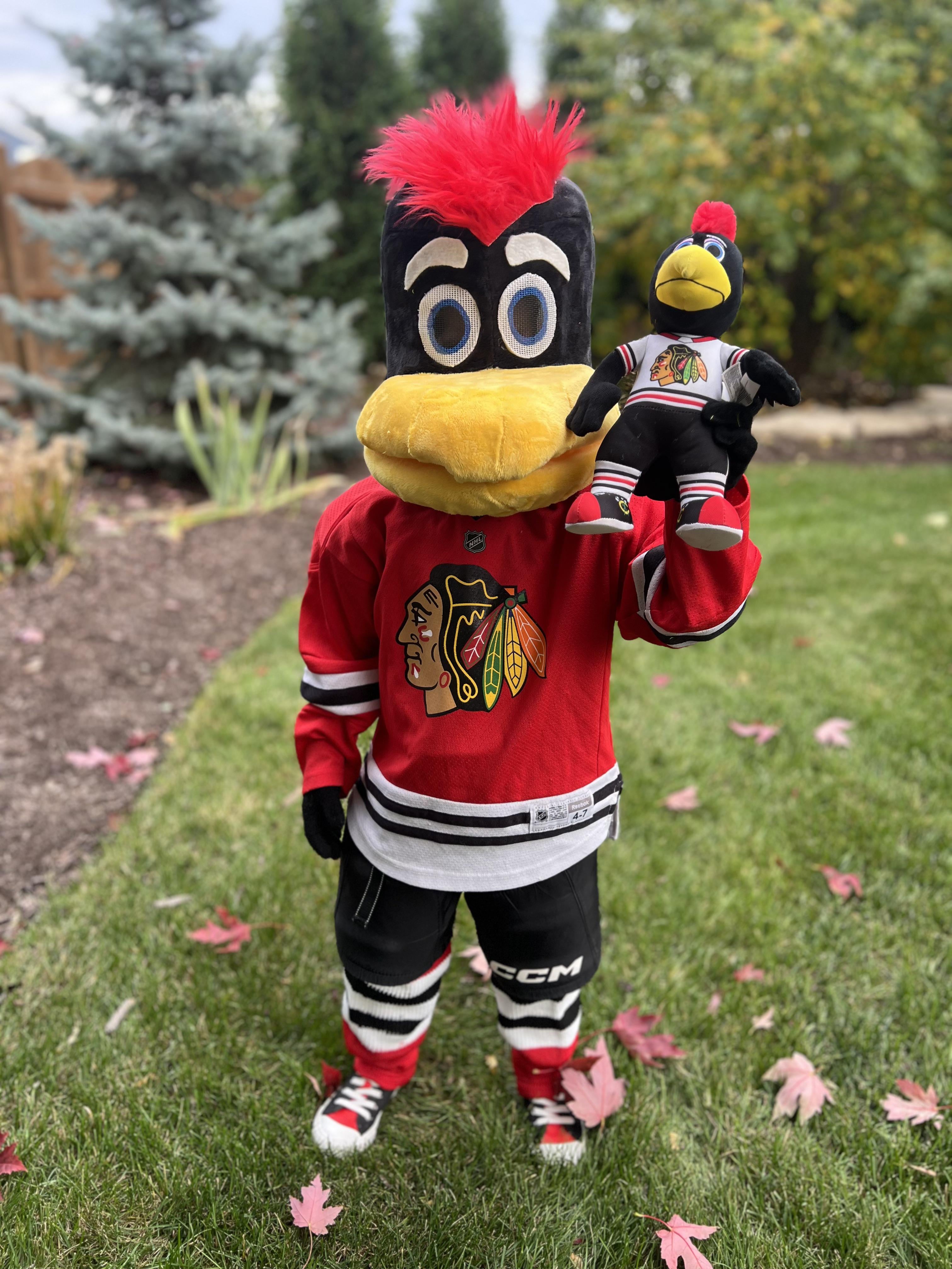 This is A+. The costume is so well made. Tell your son that lots of Blackhawks fans said he looks SO cool!!