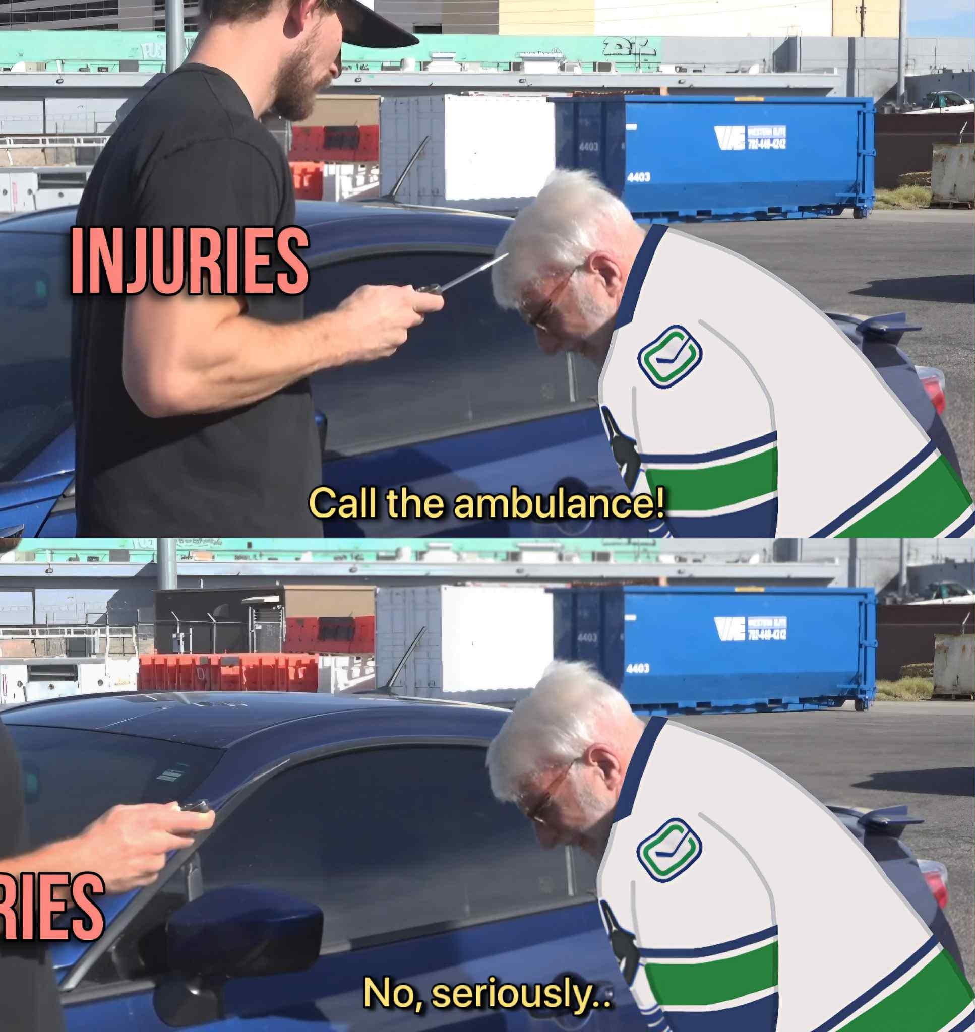 This is the most Canucks things ever, because it is almost assuredly going to get us in a hole, but no one (fans, management, ownership, media) are going to be able to agree whether the team was going to be bad in any event or whether it is just injuries and we haven’t seen the “real” Canucks to assess how good this team is.