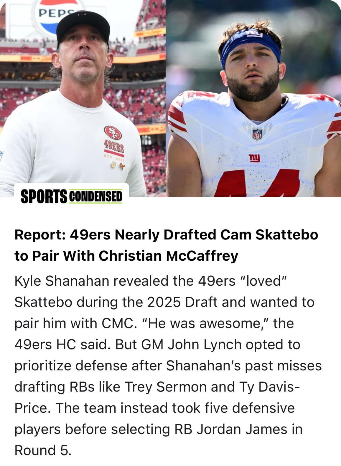 https://sportscondensed.com/news/report-49ers-nearly-drafted-cam-skattebo-to-pair-with-christian-mc-caffrey -via Sports Condensed