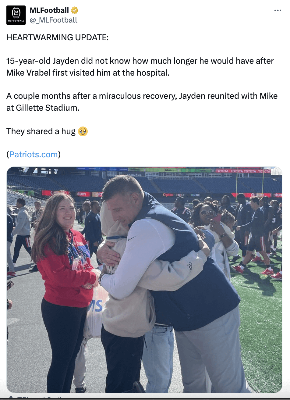 A couple months after a miraculous recovery, Jayden reunited with Mike at Gillette Stadium.
