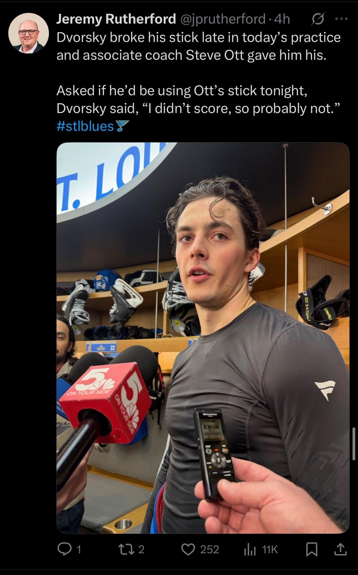 Asked if he’d be using Ott’s stick tonight, Dvorsky said, “I didn’t score, so probably not.”