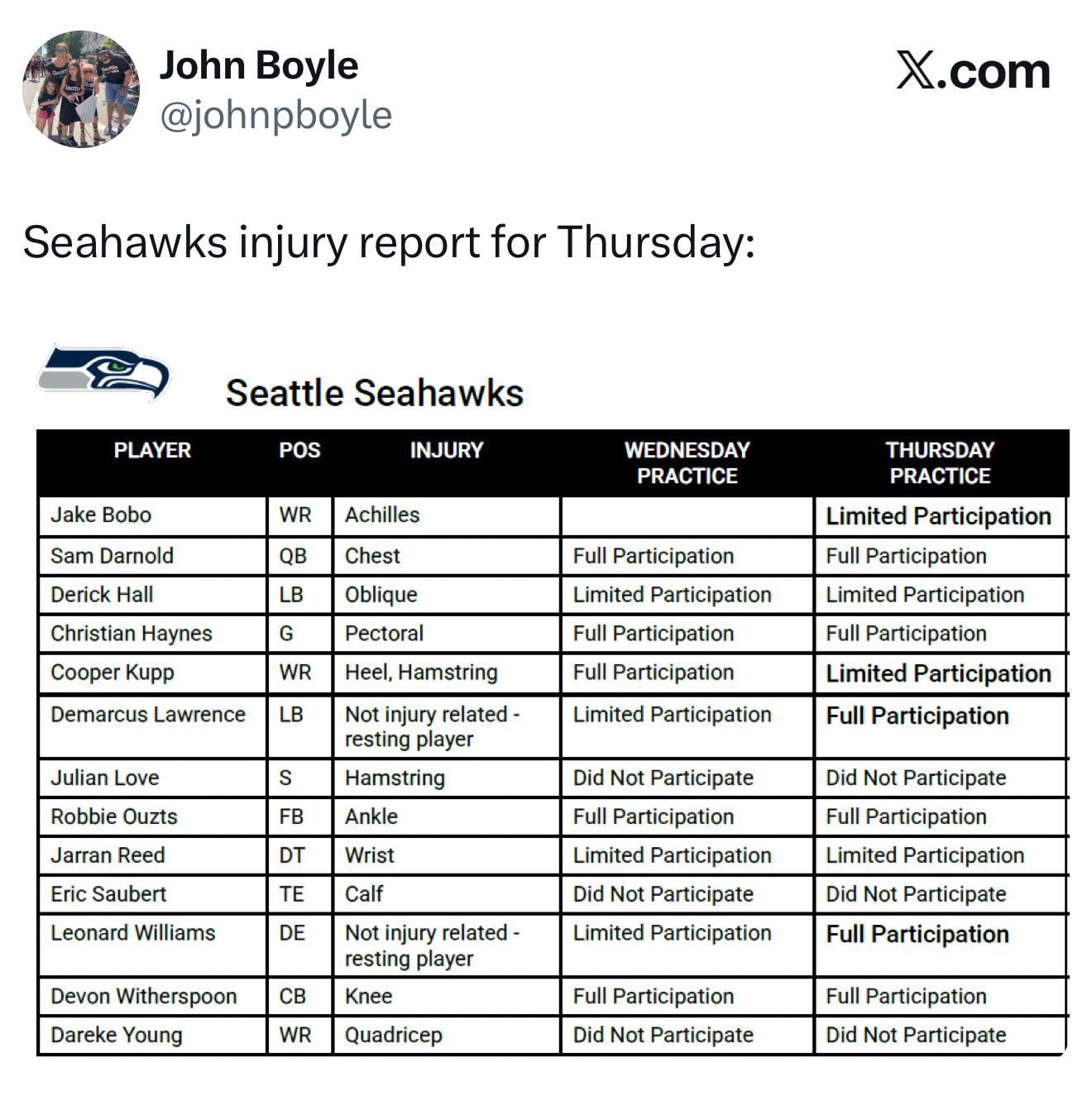 [Boyle] Seahawks injury report for Thursday