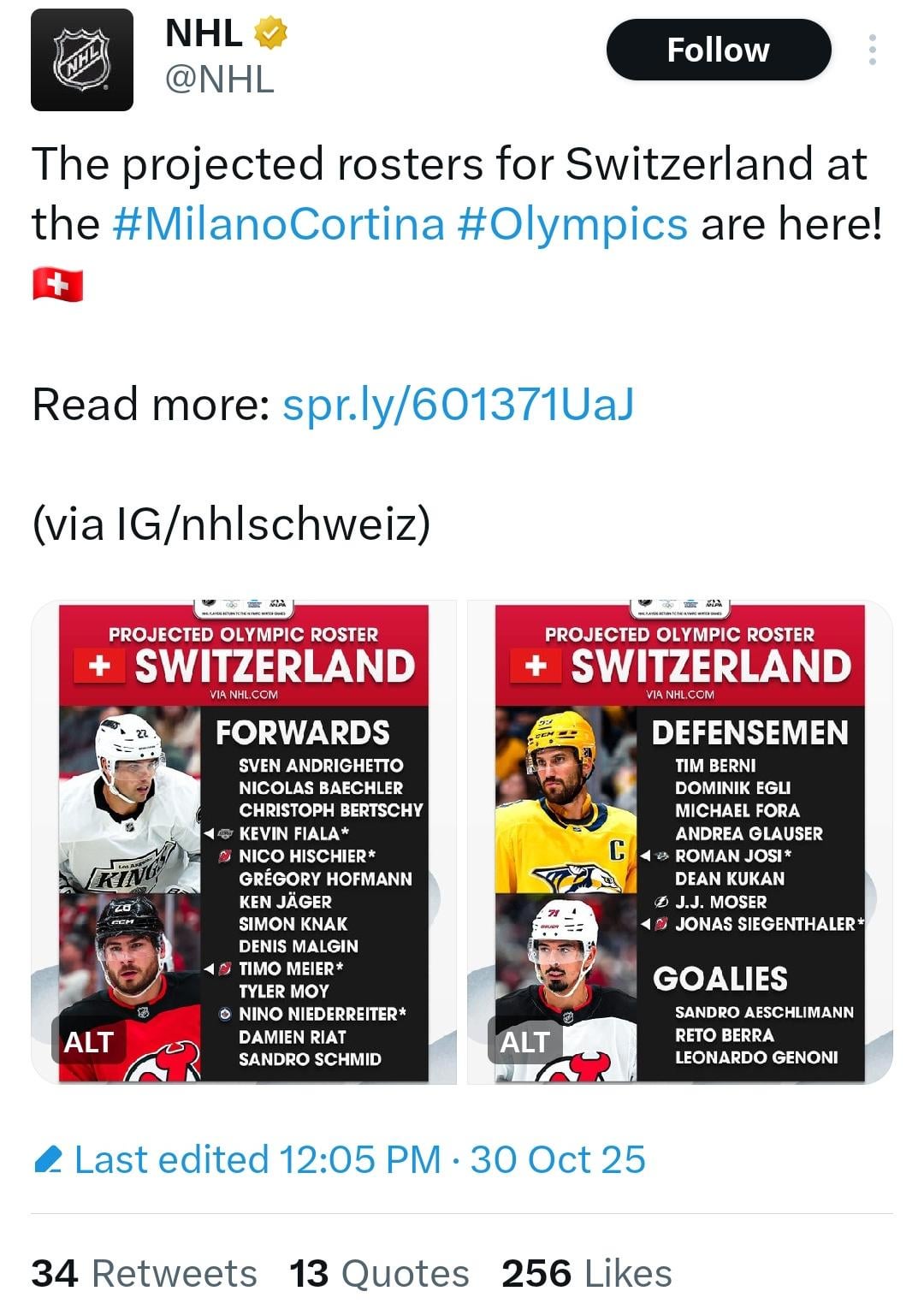 [NHL]: The projected rosters for Switzerland at the MilanoCortina Olympics are here! 🇨🇭