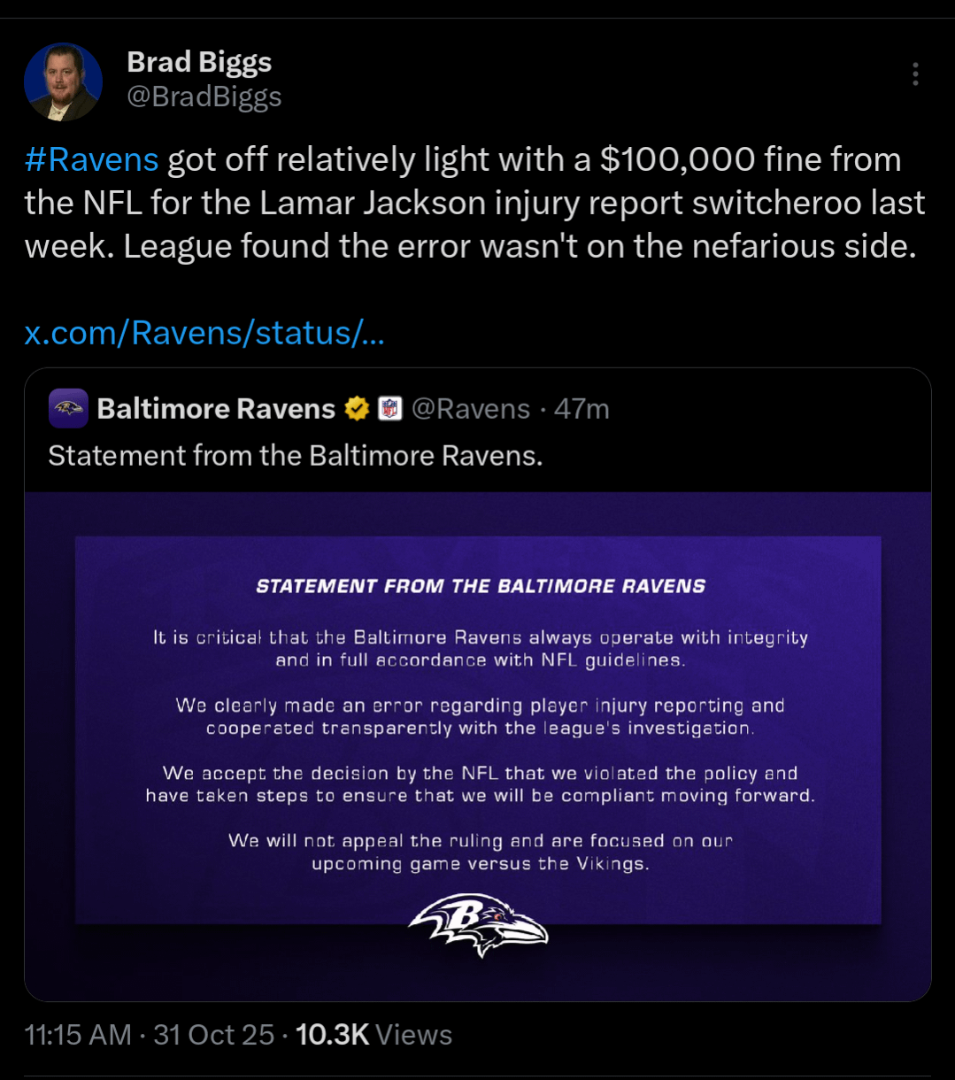 [Brad Biggs] #Ravens got off relatively light with a $100,000 fine from the NFL for the Lamar Jackson injury report switcheroo last week. League found the error wasn’t on the nefarious side.