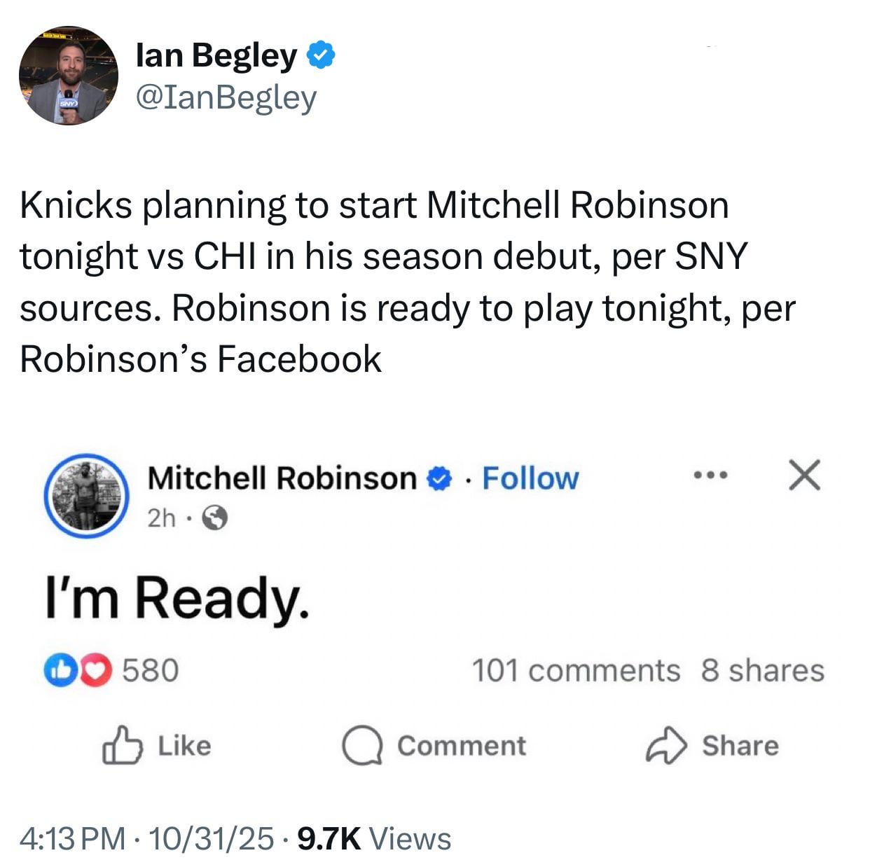 [Begley] Knicks planning to start Mitchell Robinson tonight vs CHI in his season debut, per SNY sources. Robinson is ready to play tonight, per Robinson’s Facebook