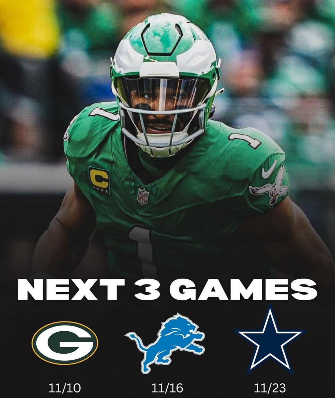 I honestly care about that Packer game more than the other two. I can’t stand that team or their fans, and Mark Murphy being a cry baby about the Tush Push to be Goodell’s puppet was the last straw. Plus Parsons always whines about it even though he got away with a blatant offsides last week. They AREN’T that good! They got no business being 5-1-1! Eagles need to make a statement.