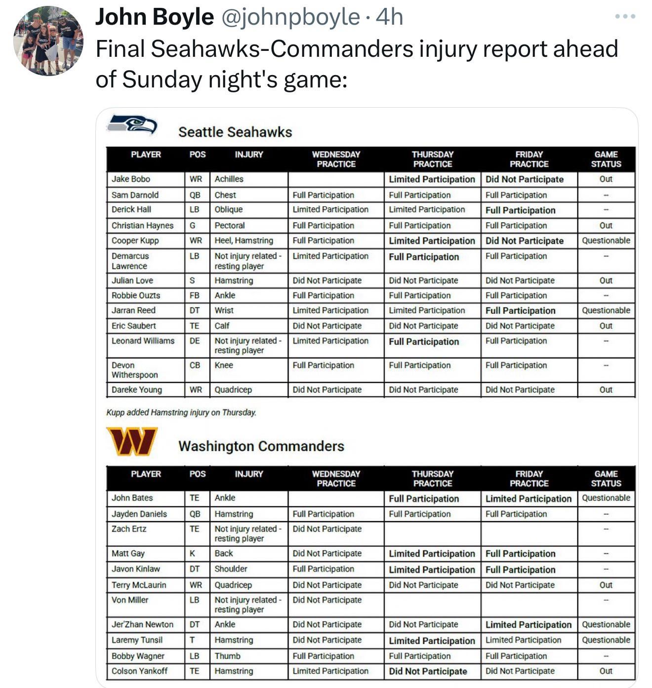 [Boyle] Final Seahawks-Commanders injury report ahead of Sunday night’s game
