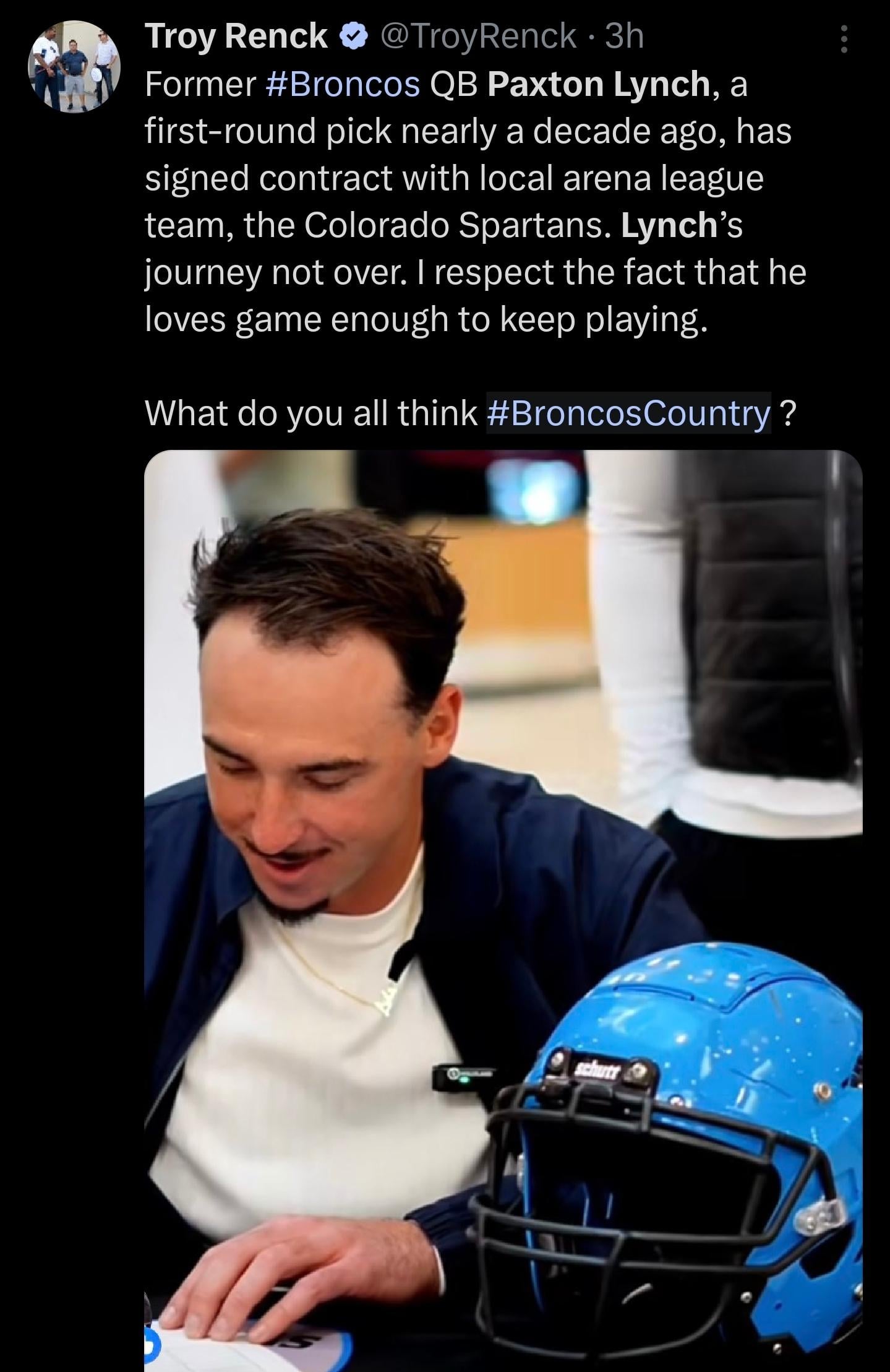 [Renck] Paxton Lynch signs with local arena league team Colorado Spartans.