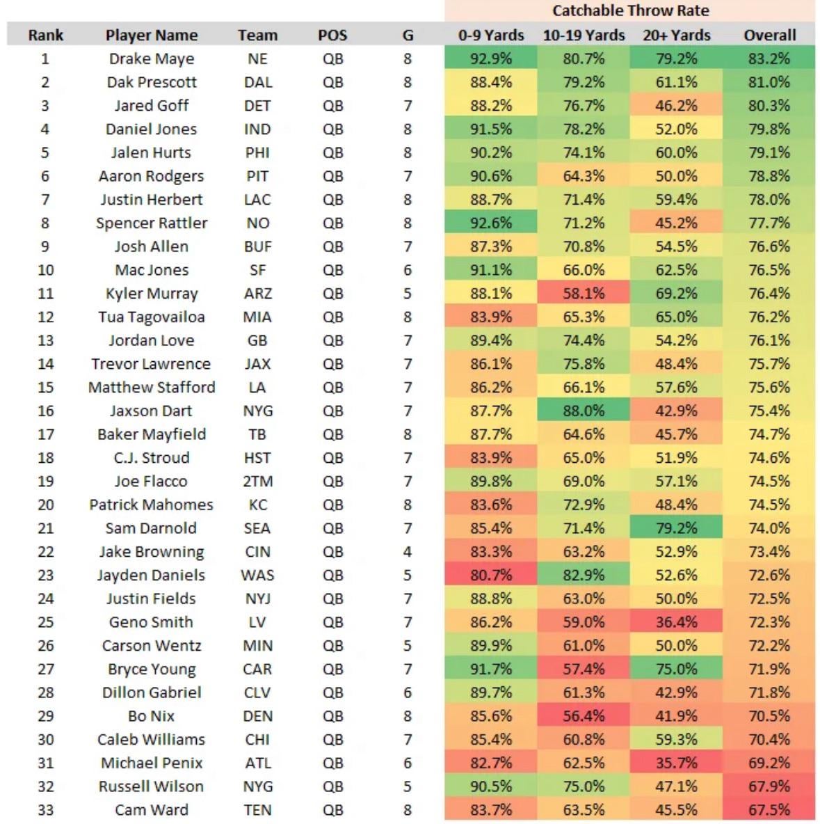 17. This tracks with what you see on the field. He makes some good throws, but also badly misses a lotnof really easy throws. I hope to chalk it up to rookie incomsistencies, but it is definitely something that could hold him back in the long run.