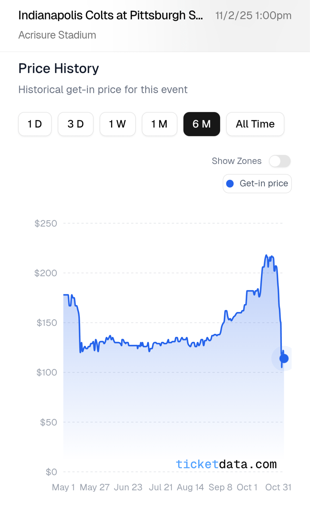 This happens with every game for every team. Same exact trend – prices start high when first available, then flattens out for months, then spikes really high a month out, then drops right before the game. Plus, it’s against the Colts, who everyone that bought tickets to begin with thought they were going to be awful.