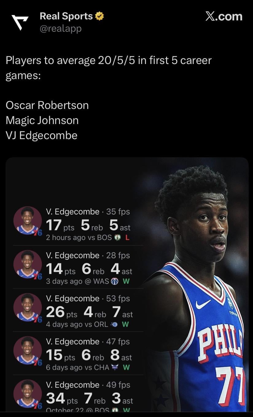 [Realapp] Players to average 20/5/5 in first 5 career games: Oscar Robertson Magic Johnson VJ Edgecombe