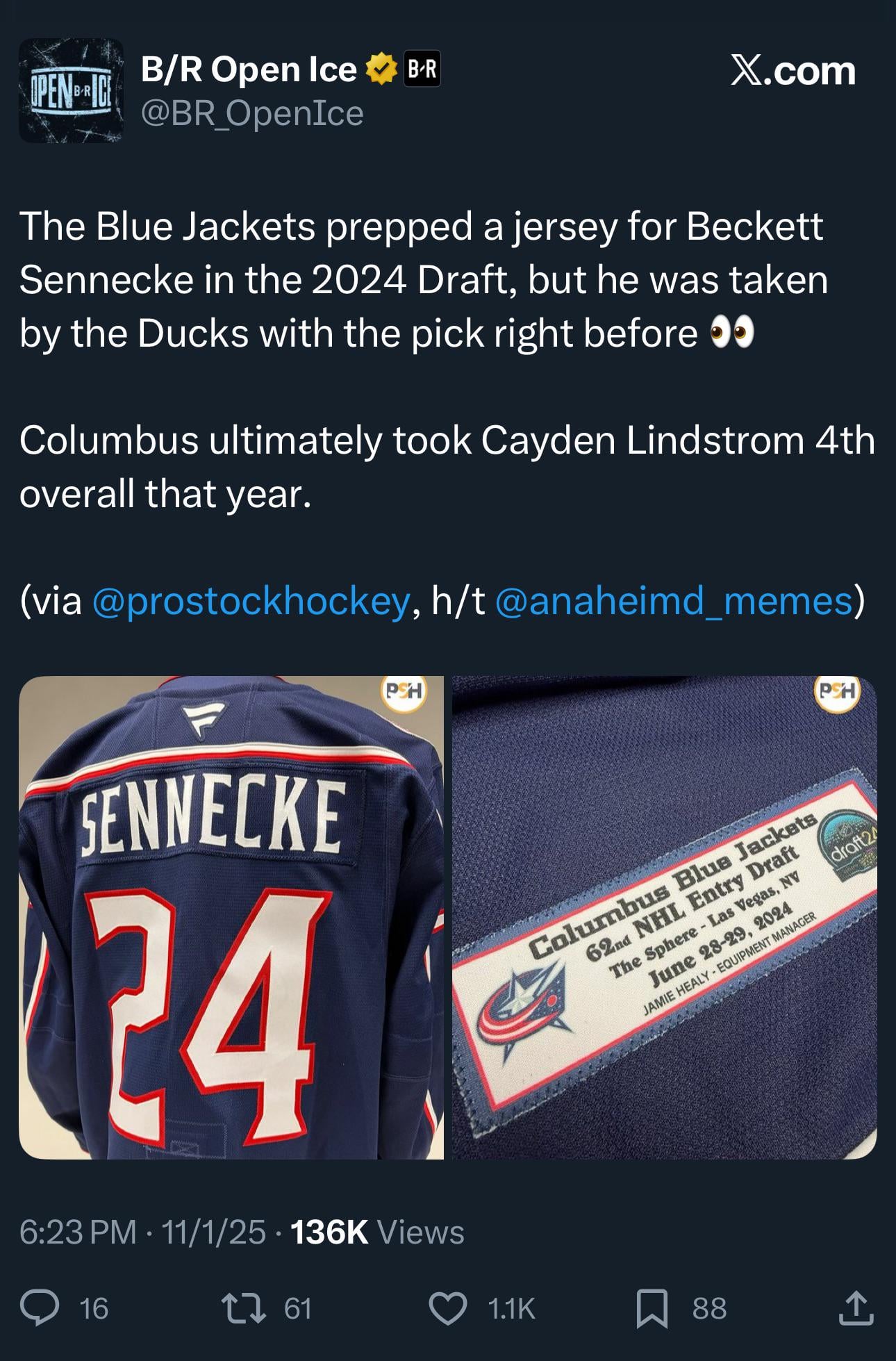 [BR Open Ice] The Blue Jackets prepped a jersey for Beckett Sennecke in the 2024 Draft, but he was taken by the Ducks with the pick right before ๐ 7 comments Thereโs a world where Leo and Beckett are both Blue Jackets ๐คฎ๐คฎ๐คฎ Guess it wasnโt a reach after all huh? ๐ I would think most teams have this done right? Iโd imagine theyโd have 3-5 ready just in case depending on draft position. Senneckeโs name looks pretty nice on the Jackets jersey but Iโm glad I will never see this again Damn, I wonder who else had him at top 5. I guess we’ll never know…(mic drop). And because the Ducks picked him so early, we got one of the greatest meme reactions too Leave a ReplyYou must be logged in to post a comment.