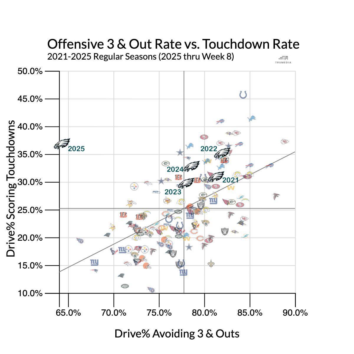 [Deniz Selman] The #Eagles offense is going 3 & out at a higher rate than any offense since 2014, while somehow scoring touchdowns at the 3rd highest rate in the NFL this season.