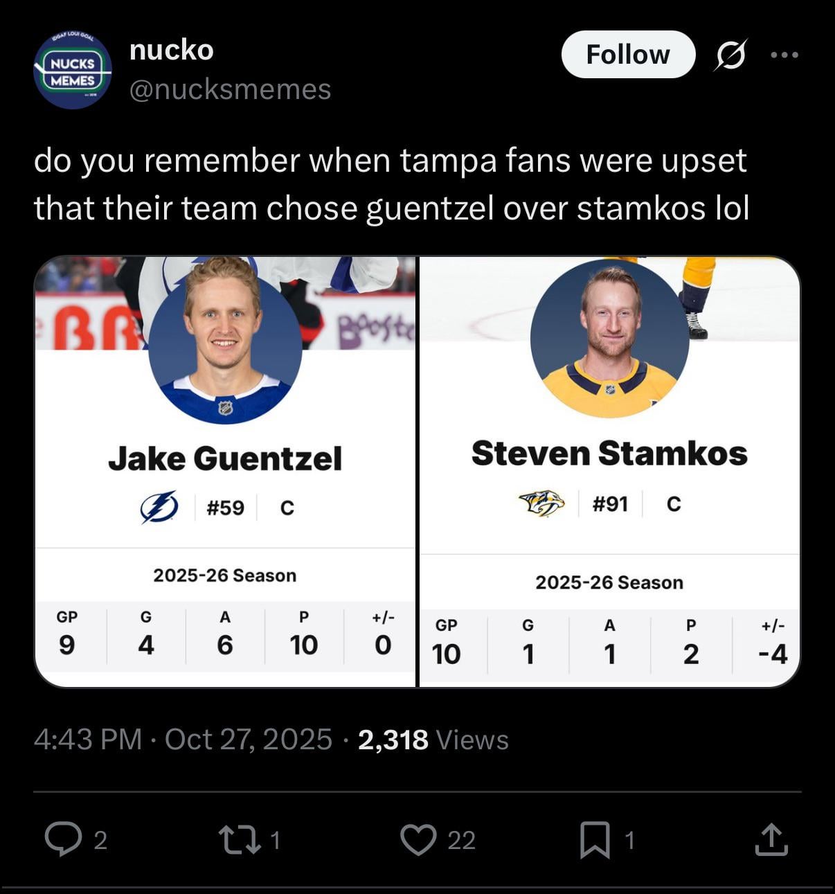 8. Funny, bumped into a Preds fan a little while ago in Salt Lake City, and he asked if I missed Stamkos. Of course I do but business is business. We couldn’t sign him for the money he wanted and Guentzel was a better signing. Thank you, Julien. Stammer will always be a Bolt and his home will always be in Tampa but what happened makes sense on every level.