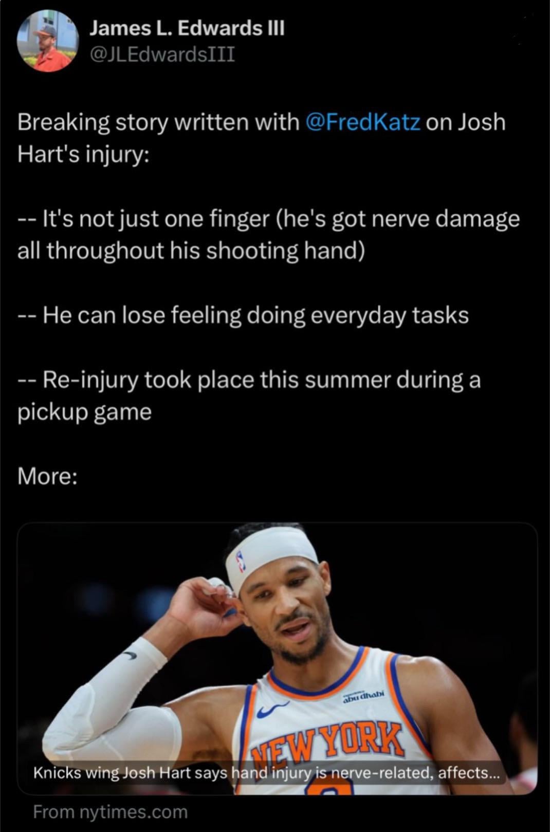 The organization should be telling him he has to get the surgery. I’d rather have a fully healthy Josh Hart in the playoffs than a beat up Josh Hart all year.