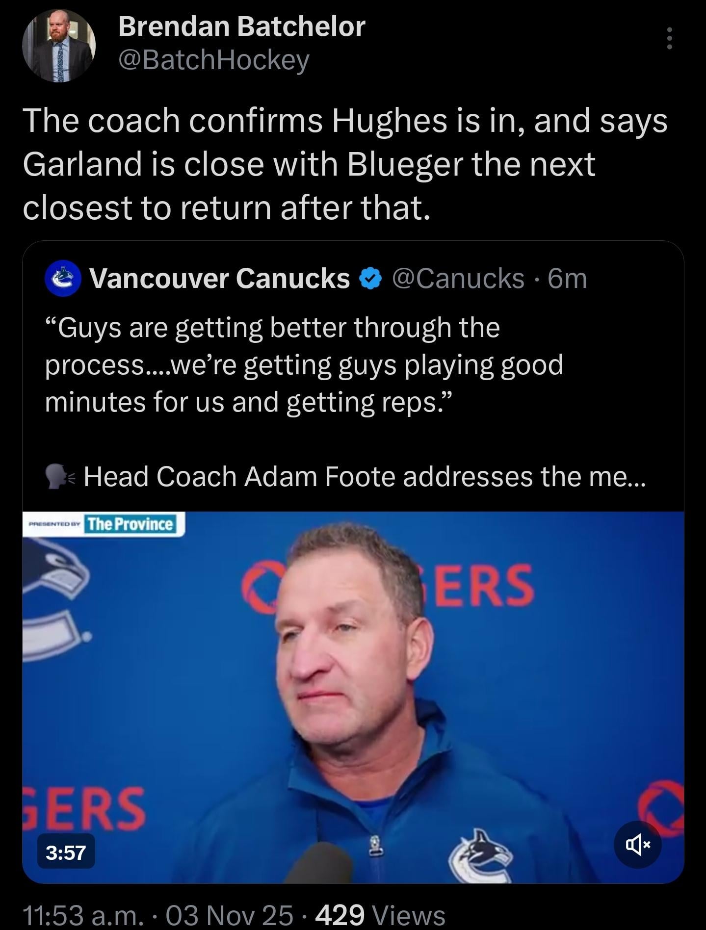 [Batchelor] The coach confirms Hughes is in, and says Garland is close with Blueger the next closest to return after that.