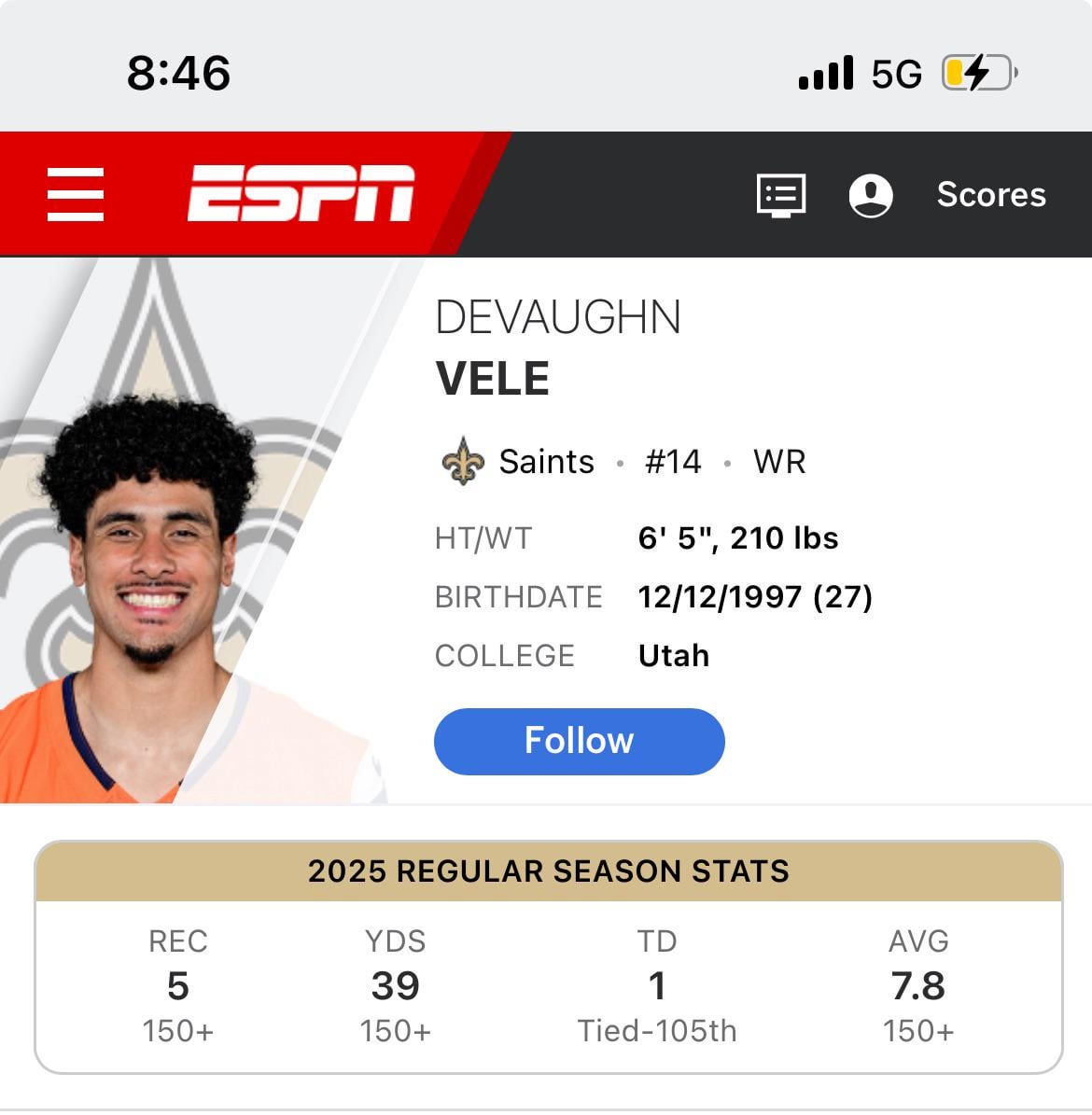 This thread is a bummer to read as a Broncos fan. I was curious how Vele was doing, we all loved him in Denver last year, but it seems like he’s not doing much for you all. I thought he could serve as a good big-bodied/sure-handed safety blanket WR to help develop your QBs, he was good at that last season in Denver.