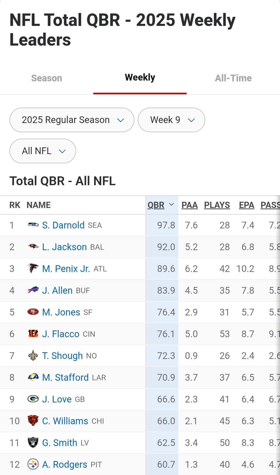 I don’t think that we can rely on QBR for any QB. How do they even measure it? Nobody knows and it’s like 153.6 for a perfect score.