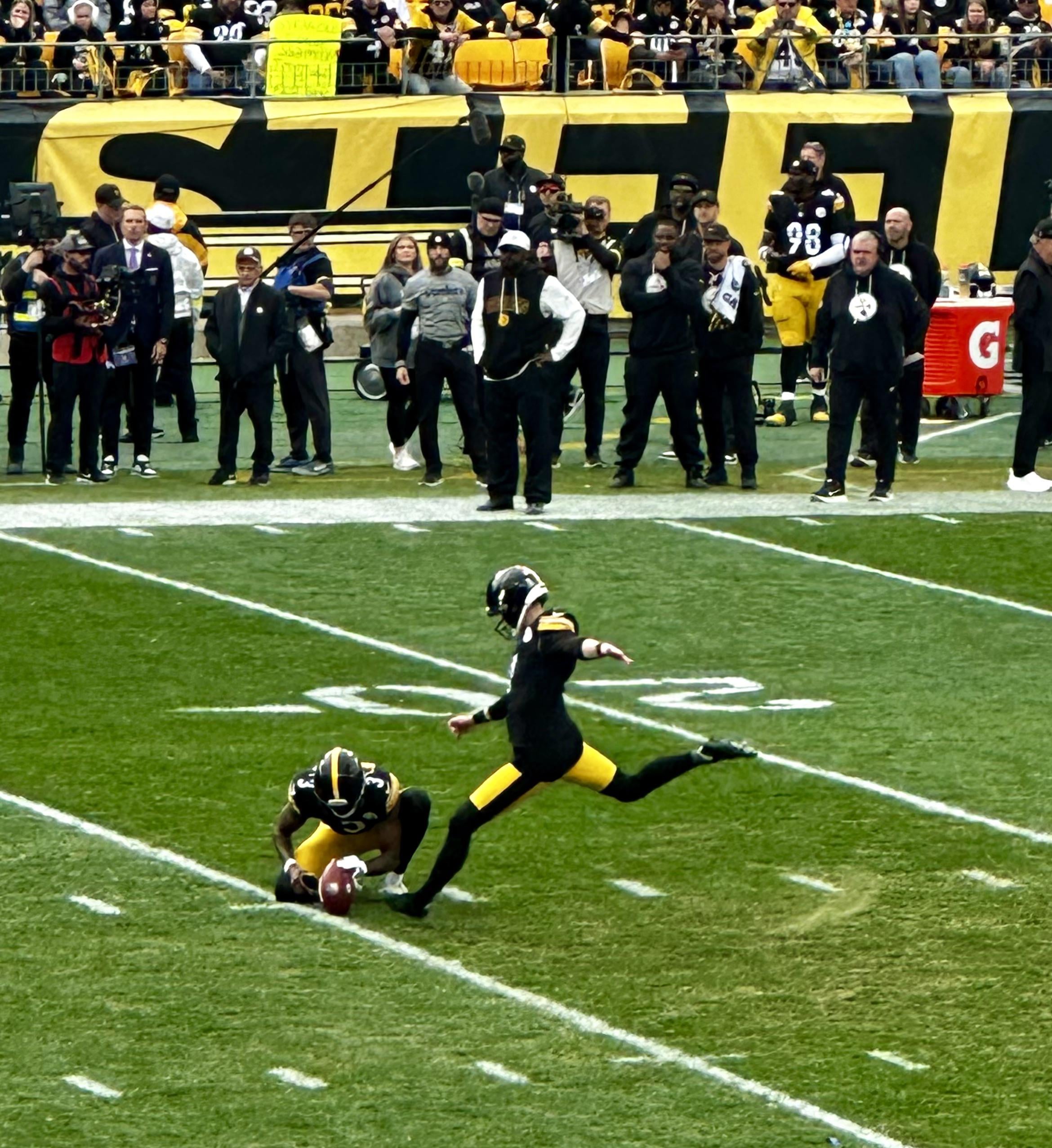 As a fellow photographer, I raise a glass to your excellent shot. Not only do you have Boswell in perfect shot, you also have him framed with Mike Tomlin and the sideline people watching him – and the STEEL background against the rails, that helps too. And Corliss Waitman is deep in concentration, making sure he placed the ball perfectly – with the laces outward. ALL HAIL THE BOS GOD, PRAISE BE UPON HIS GOLDEN LEG!