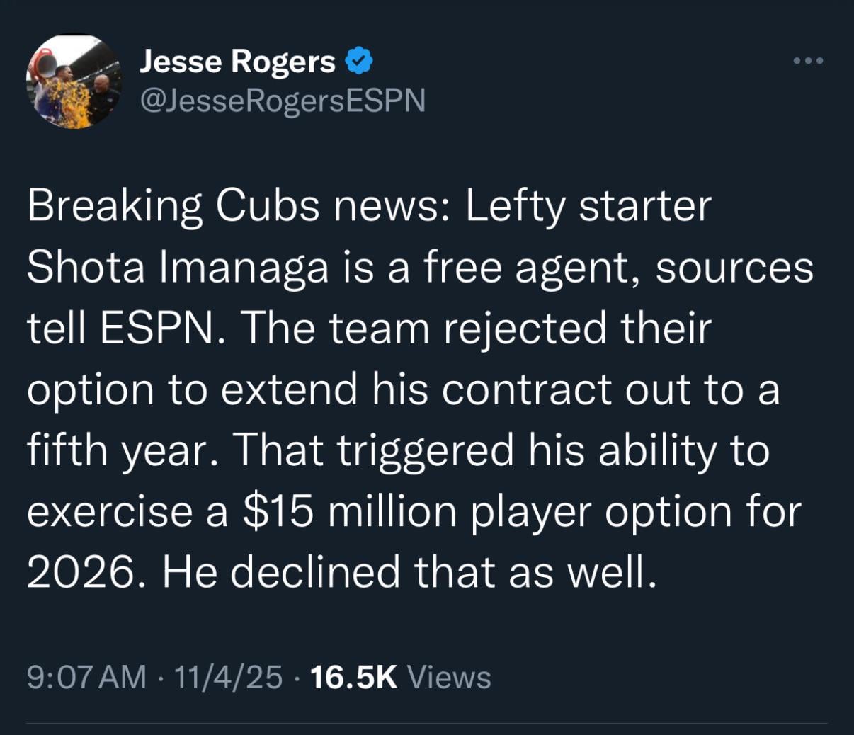 [Jesse Rogers] Breaking Cubs news: Lefty starter Shota Imanaga is a free agent, sources tell ESPN. The team rejected their option to extend his contract out to a fifth year. That triggered his ability to exercise a $15 million player option for 2026. He declined that as well.