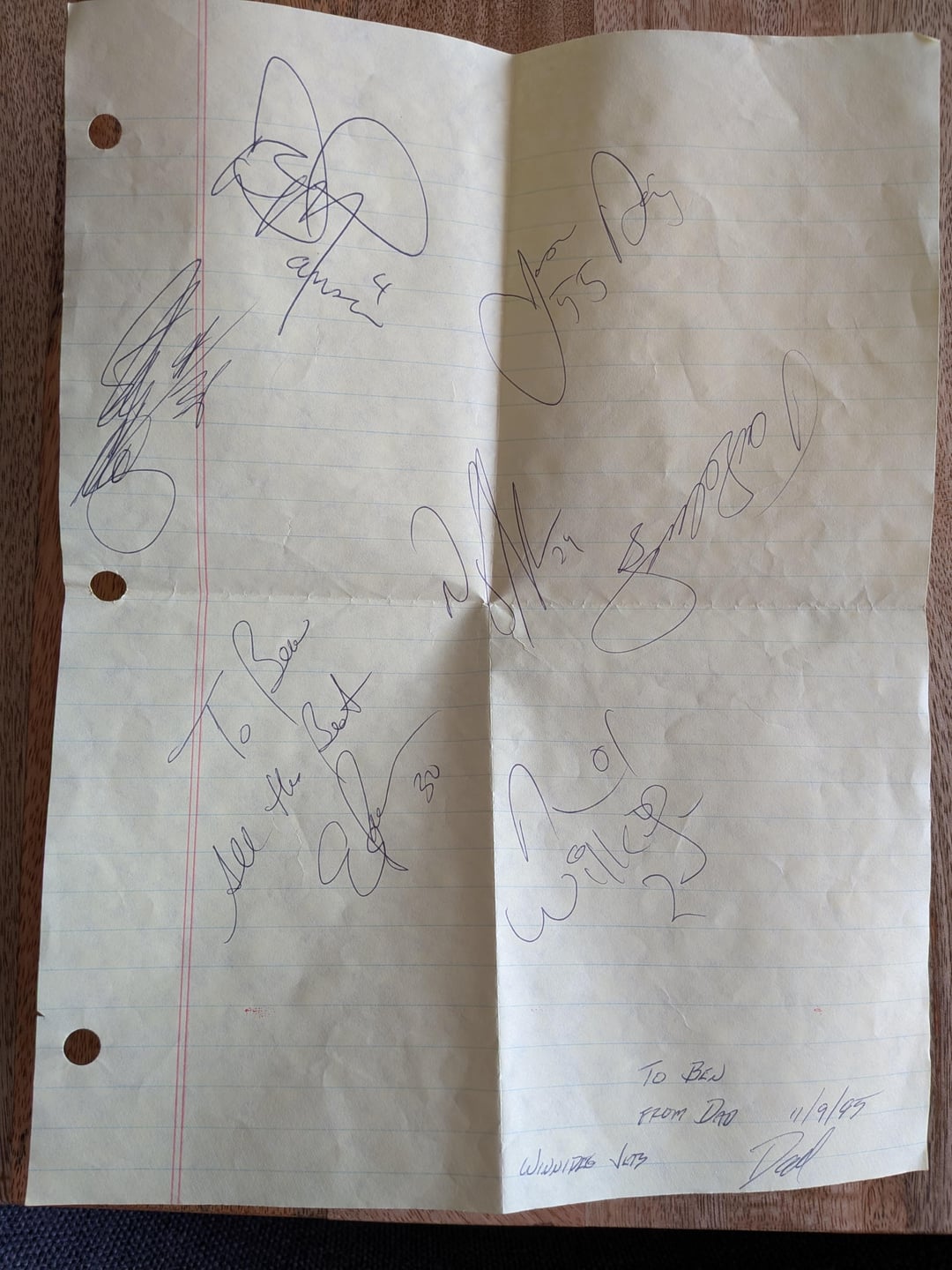 Back in 1995, my dad was on a plane when a bunch of large, well-dressed lads boarded. He asked what they did for a living. "Play hockey," was the answer, specifically, for the Winnipeg Jets. They were kind enough to pass around a piece of yellow legal pad paper (my dad always carried some) to collect a few signatures for his hockey-obsessed kid back in St. Louis.