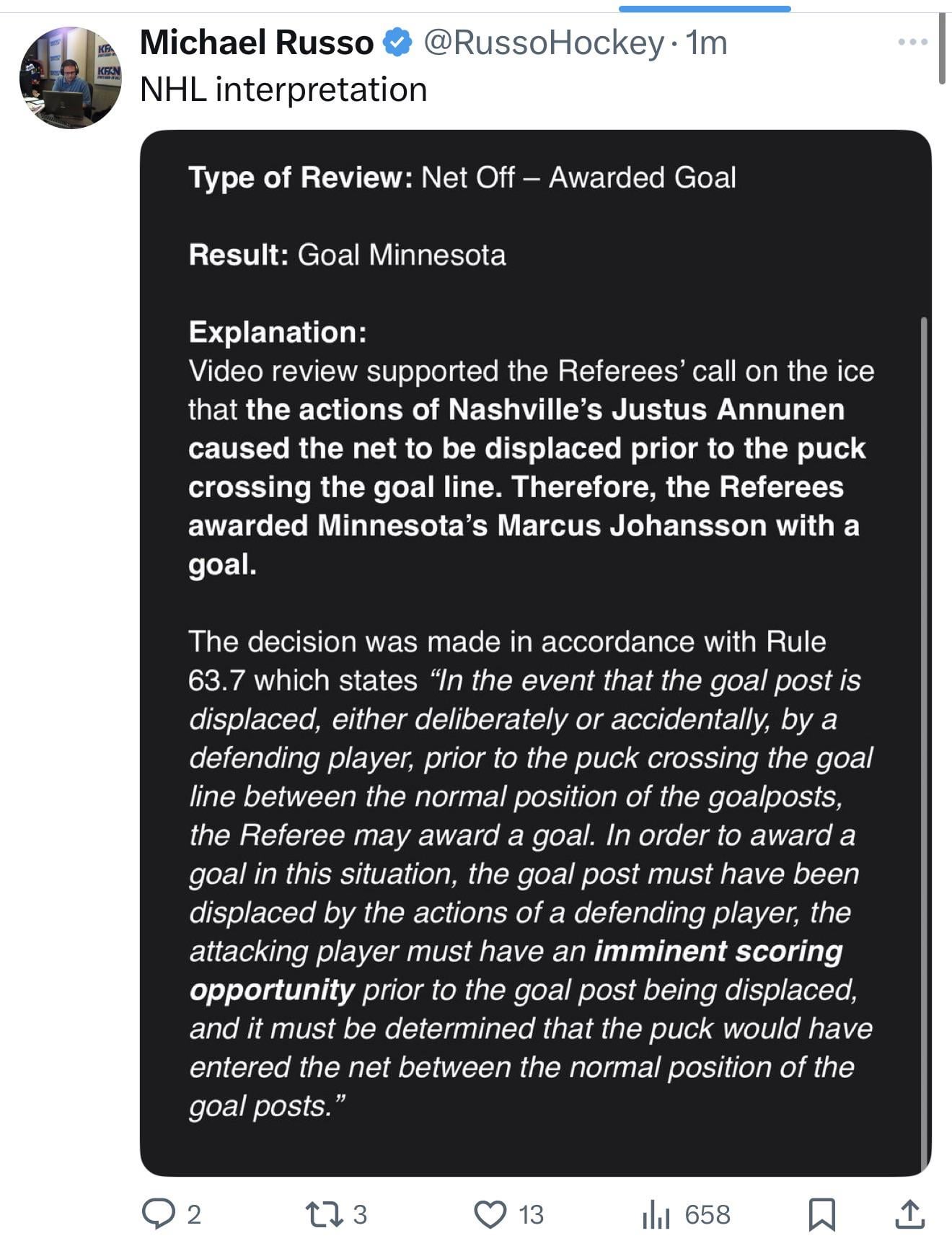 Honestly, the rules are written with enough grey area that this seemed like mostly a judgement call. There’s no special provision as to what should happen in that specific instance, it was weird. I think in the spirit of the rule, that should be a goal. Wild were in imminent scoring position, preds goalie knocked the net off, puck went through where the net was supposed to be