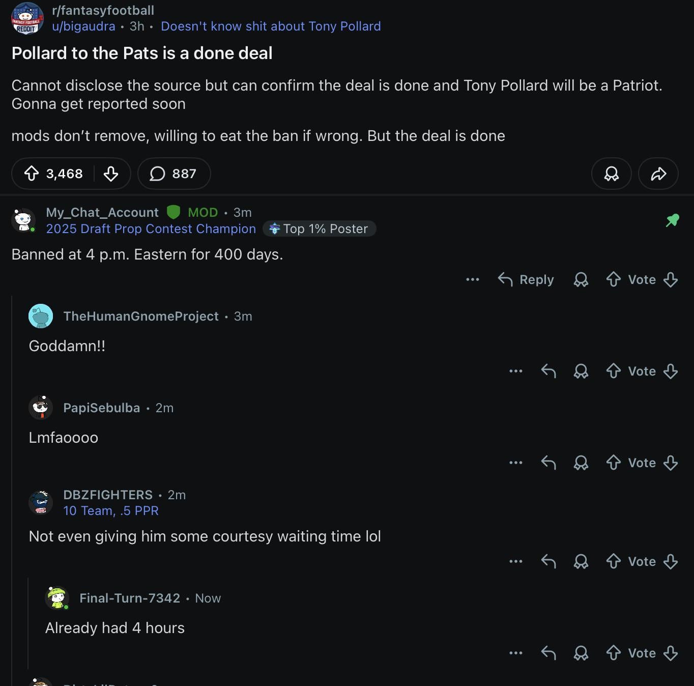 He could’ve been right that a deal was done, but was ultimately wrong about Pollard being a Patriot so he still does deserve the ban. It’s like getting off on the murder charge but found guilty of conspiracy to commit.