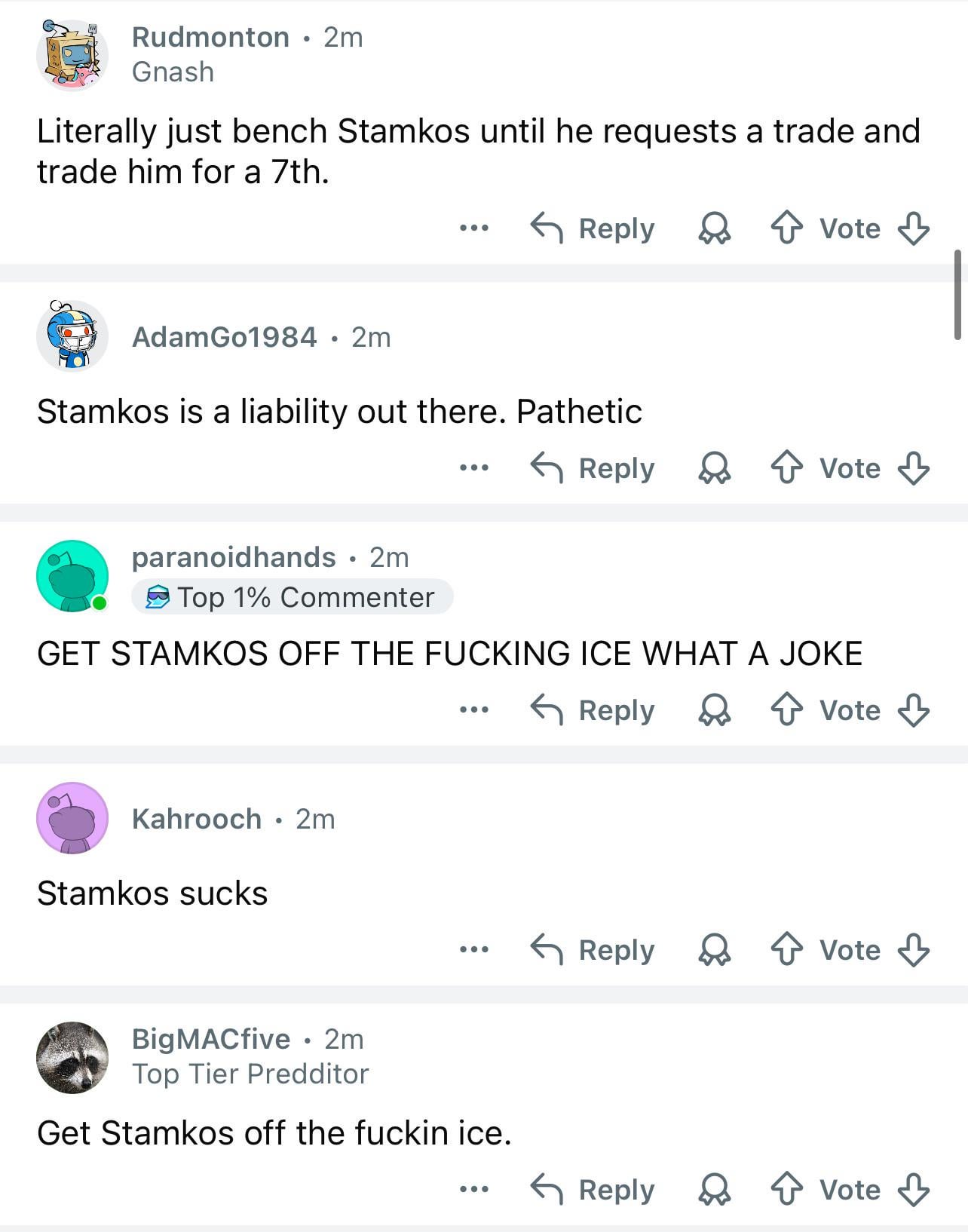 No shade to any of these comments, I get it, but just funny it was like every comment in a row and then he ties it with 0.3 left lol 4 comments Oh what a great player he is🤪 Because he don’t catch a standard pass at the blue line in a crucial point of the game. It’s not rocket science No joke, I was trash talking him just as he was scoring that goal. Then I shouted yes stammer go earn that damn paycheck. I’ll own that I was actively shit talking him when the goal went in and then I yelled loud enough my (noise sensitive) 4 year old cried 😂 Leave a ReplyYou must be logged in to post a comment.