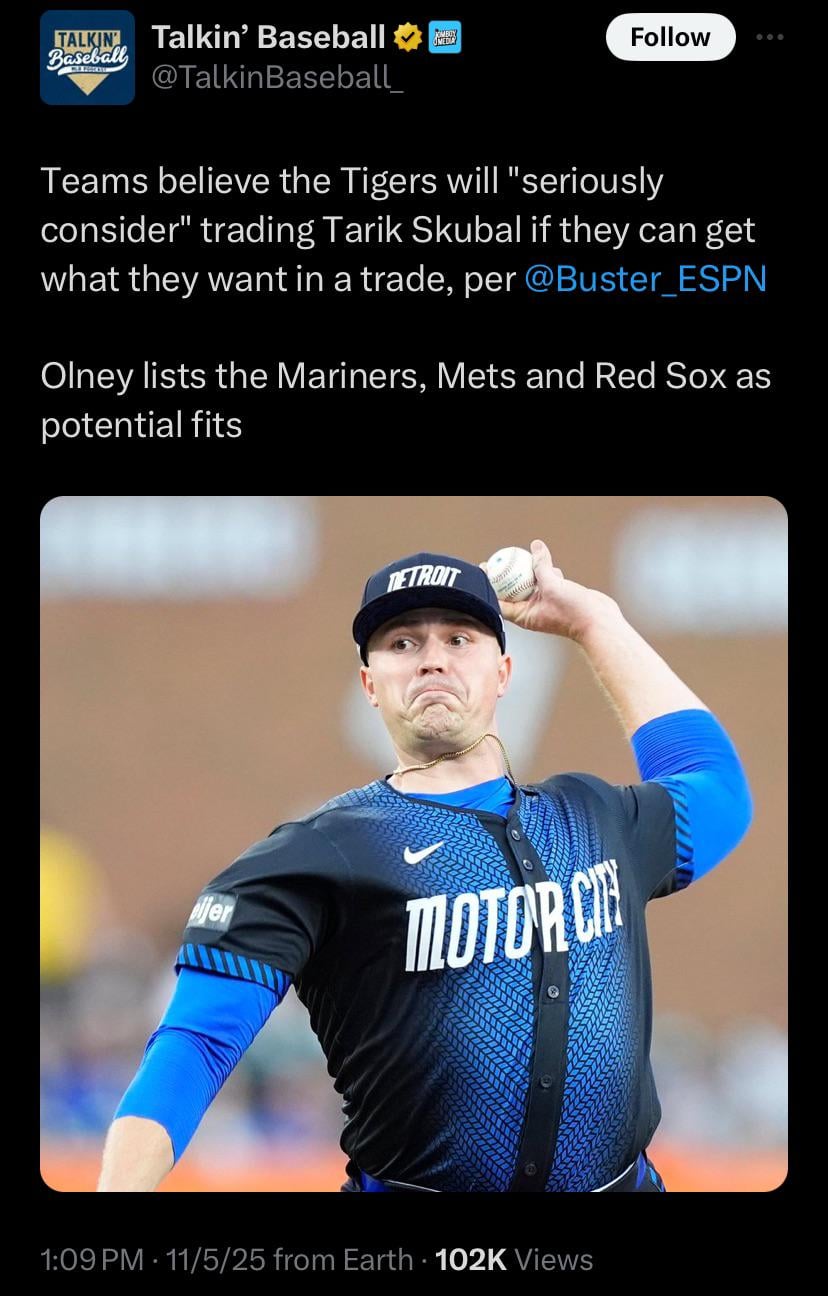 “Everyone wants Tarik Skubal, the soon-to-be two-time American League Cy Young winner, but as of now, the industry expects Detroit to hold onto him, even with his free agency approaching after the 2026 season.”