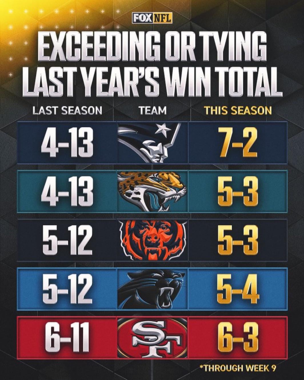 https://x.com/nflonfox/status/1986222000759828503?s=46&t=FpFflOWaIBpw-VtZB6L1eA 6 comments I won’t lie I spaced that the 9ers finished so badly last year. Wild how well they’re recovering this season even with all the injuries still. You know it’s going downhill if the opening line from the coach is “it starts with me first” The bears still look like ass though. Never even noticed that the Bears are 5-3 damn 6-2* that bengals game will always have an asterisk You know, I’m kind of proud of the Panthers. That’s good for them, fellow long-time suffering fanbase. More proud of the Jags, of course. Leave a ReplyYou must be logged in to post a comment.