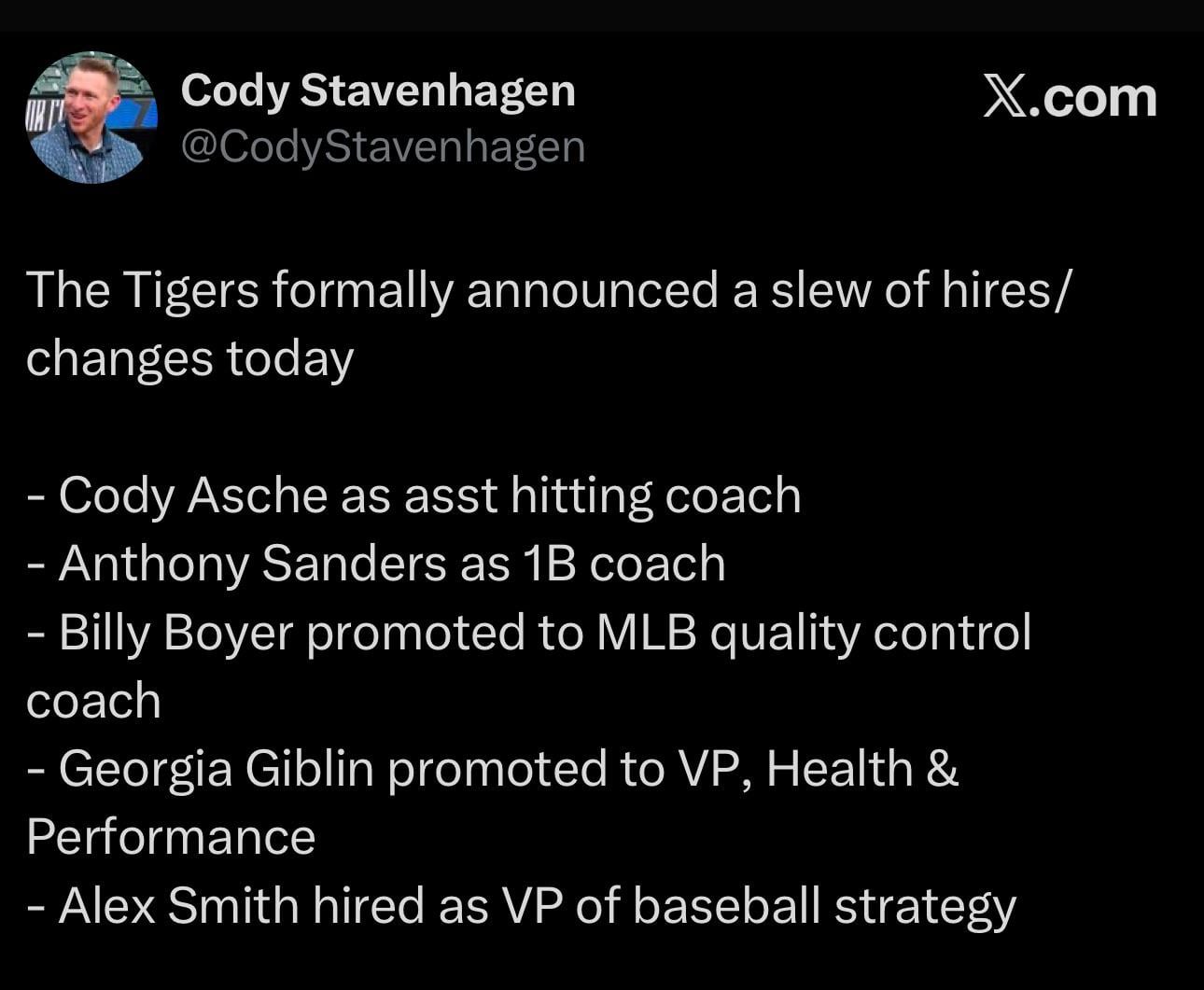 The Tigers formally announced a slew of hires/changes today 18 comments Are those better than the people who had the jobs previously? Can any of those guys hit with bases loaded? Assistant Hitting Coach before the actual hitting coach? Or hitting coach who by definition is an assistant? What the heck is MLB quality control  Is George Lombard Sr still on the staff? Georgia still in the organization is cool. A few years back she won some kind of award for the organization. I’m too lazy to Google what it was. Can we hire a Japanese scout to go scout the market over there? Seems to be working out well for LA. Gary Jones won’t return to #Tigers’ coaching staff in 2026 after four seasons https://archive.ph/2025.11.05-212132/https://www.freep.com/story/sports/mlb/tigers/2025/11/05/detroit-tigers-coach-gary-jones-coaching-staff-2026/86965722007/ Man I haven’t seen Kodeyashi in awhile https://www.reddit.com/r/phillies/s/3u22KU4erU Former Kansas City Chiefs and Washington Football Team Quarterback Alex Smith? Billy beane type guys?? This guy? https://www.reddit.com/r/phillies/s/tVjJsP3p0A Good Lord. This changes everything Alex Smith? The NFL Quarterback!?  Gotta control quality. You don’t want it leaking out all over the place getting on everything. And can any of these guys talk Pres of baseball guy Harris from signing the likes of Charlie Morton Chris Paddock or Alex Cobb ? Leave a ReplyYou must be logged in to post a comment.