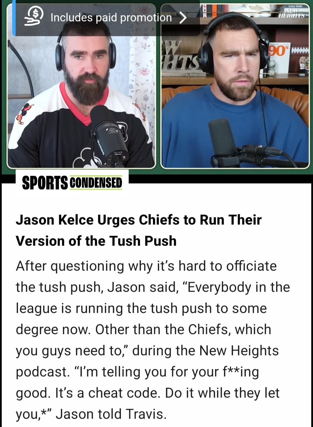 Travis immediately said the Chiefs are not going to go for the tush push. But its Jason's question to officials that struck me the most. Is it really so tough to officiate the tush push? If it is so, why can't technology be used at least now, considering NFL is one of the less technoligy driven leagues around the world, instead of calling for a ban.