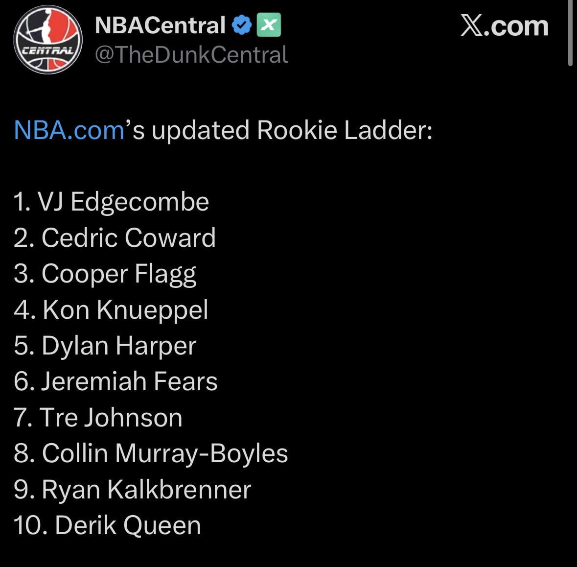 Feels good to have 2 rookies in the top 10 rookie ladder 3 comments Goofy list. Cooper Flagg hasn’t even been playing that well the hype alone is the reason he’s that high I just want to state for the record, I’m so glad we ended up with Fears over Bailey Give it a week or2, and queen is at 5 or higher Leave a ReplyYou must be logged in to post a comment.