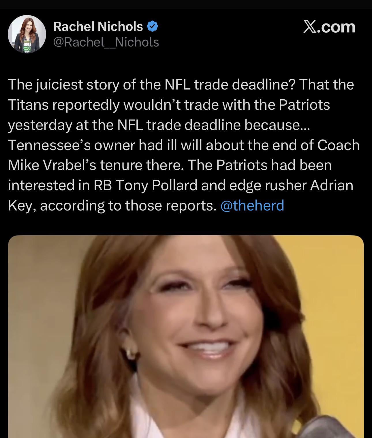 Doesn’t Rachel Nichols cover NBA. What the fuck does she even know about the Titans? Can’t even get the players names correct