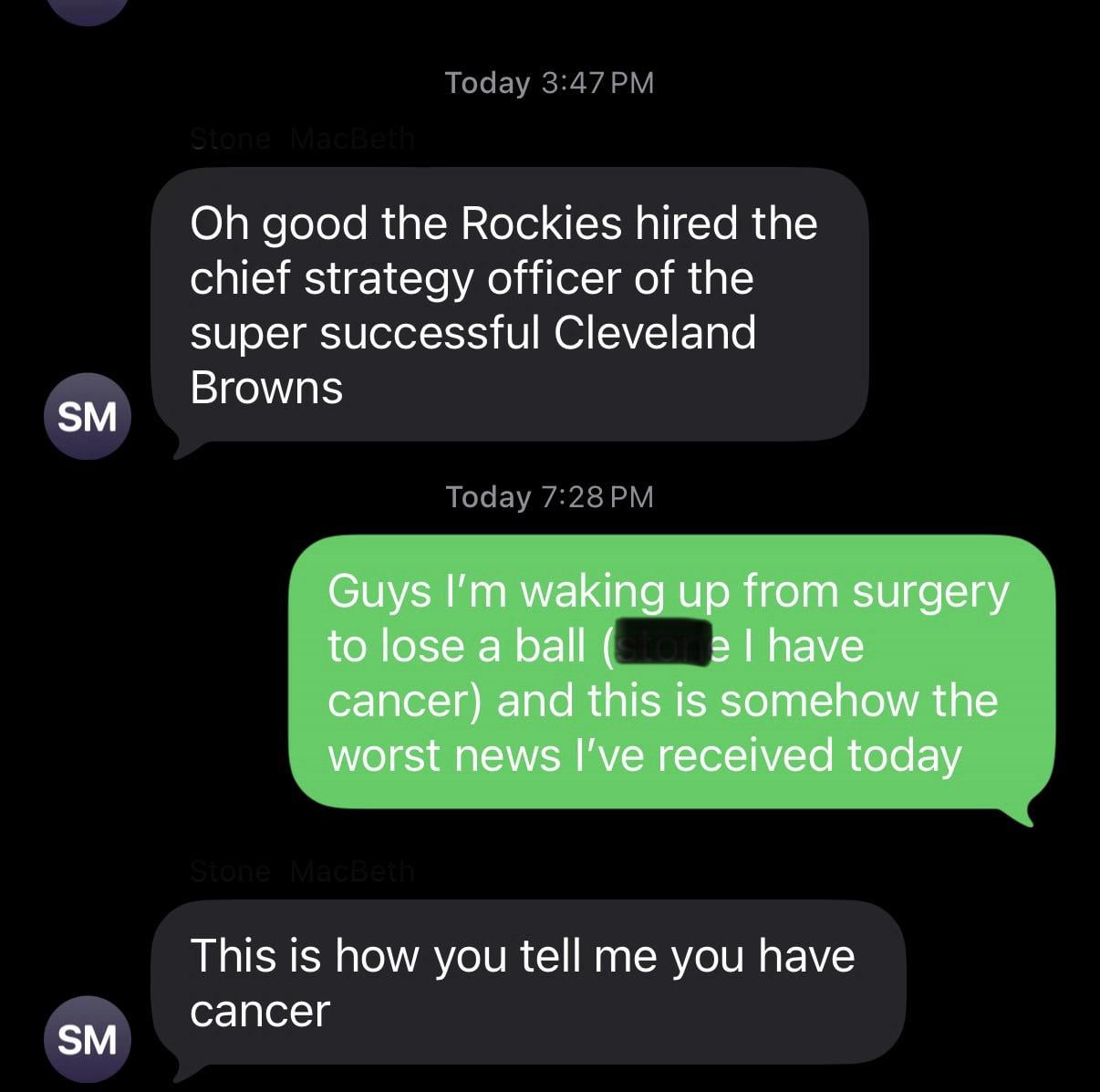 Only the Rockies would hire somebody from another sport entirely to run their ops lol Speedy recovery, OP!