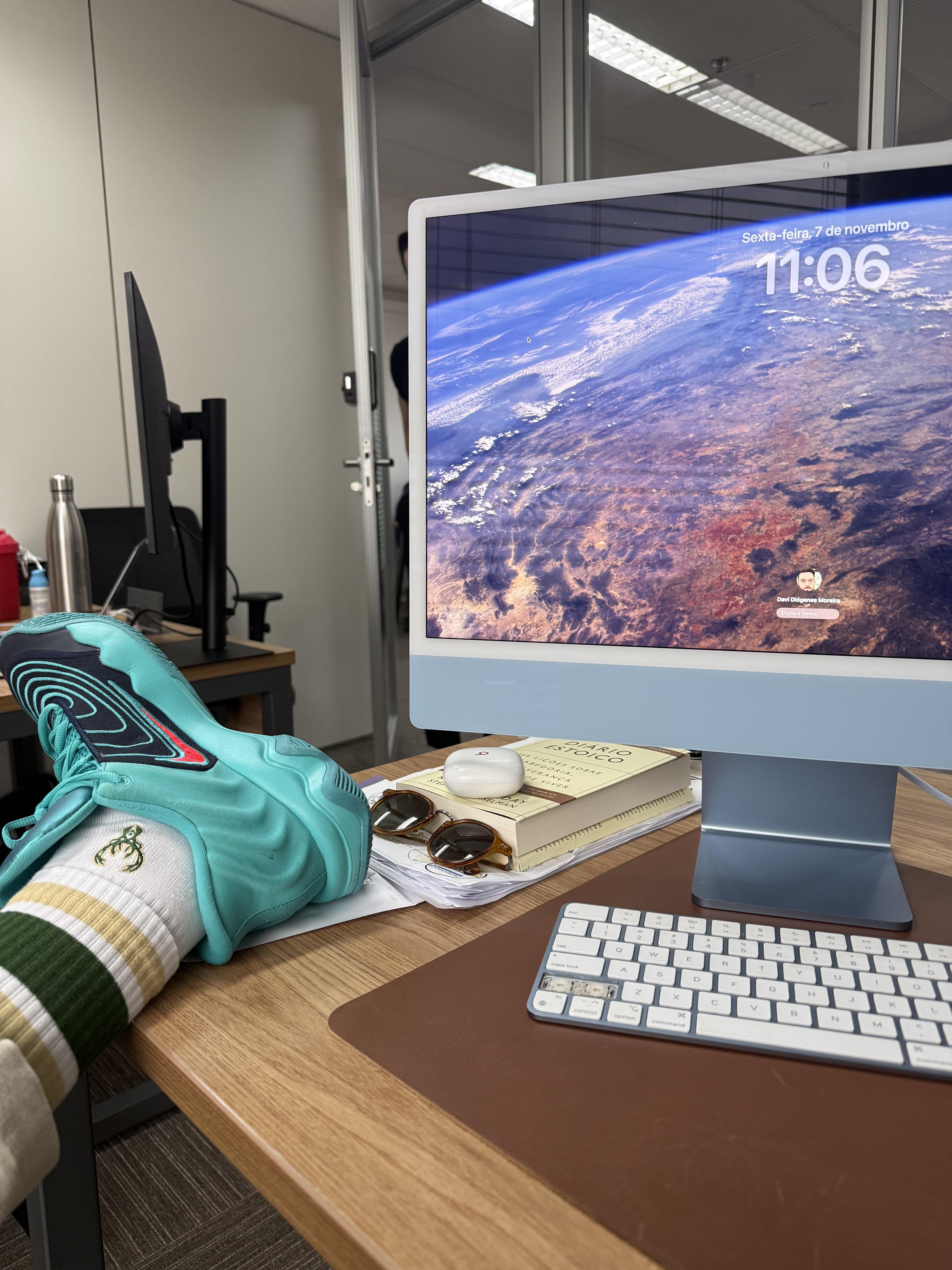 Boss walks by and sees shoes on desk. “It’s a spiritual thing, you wouldn’t understand.” Meanwhile Earth screensaver watching over the ritual.