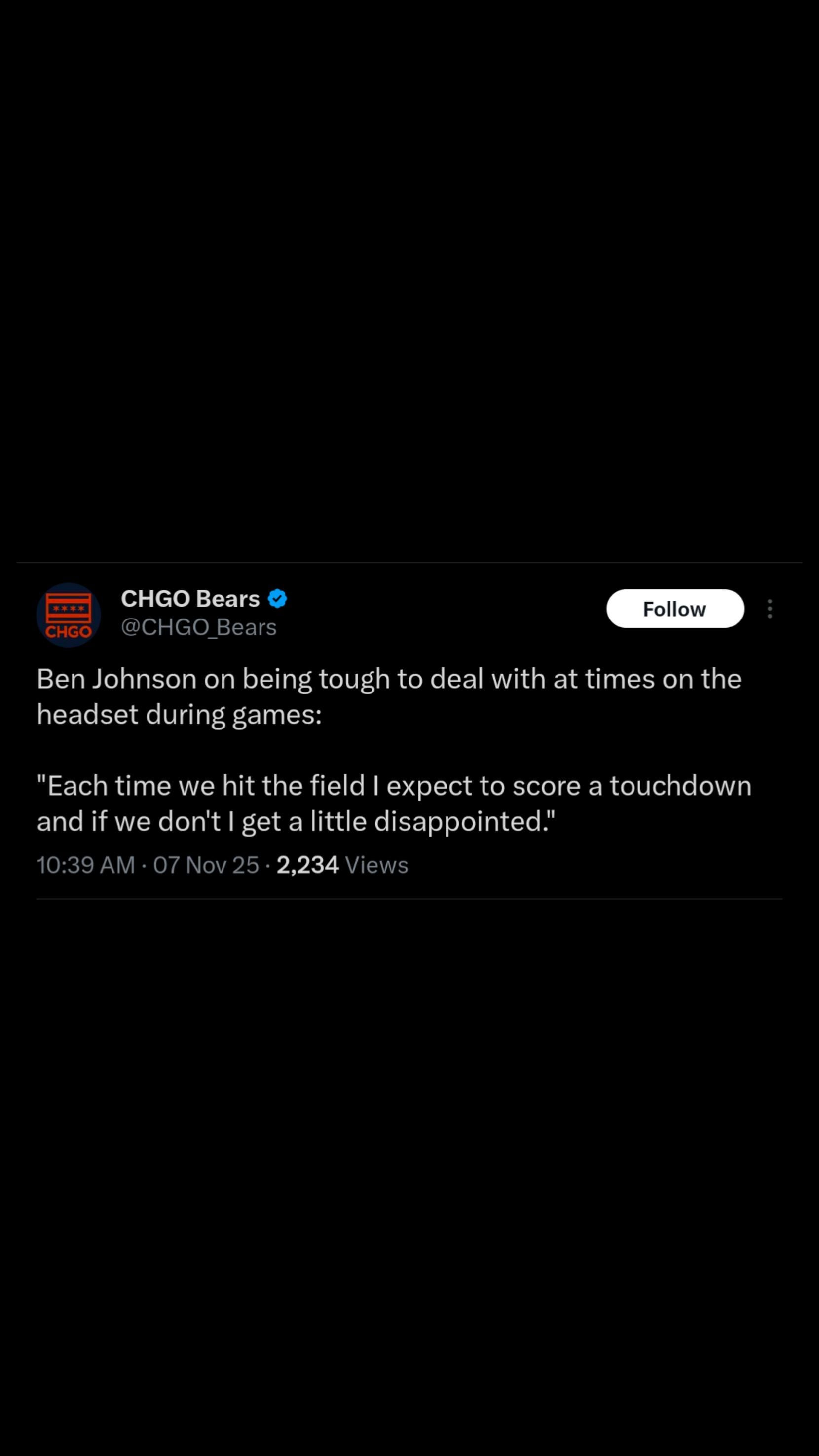 [CHGO Bears] Ben Johnson on being tough to deal with at times on the headset during games: “Each time we hit the field I expect to score a touchdown and if we don’t I get a little disappointed.”