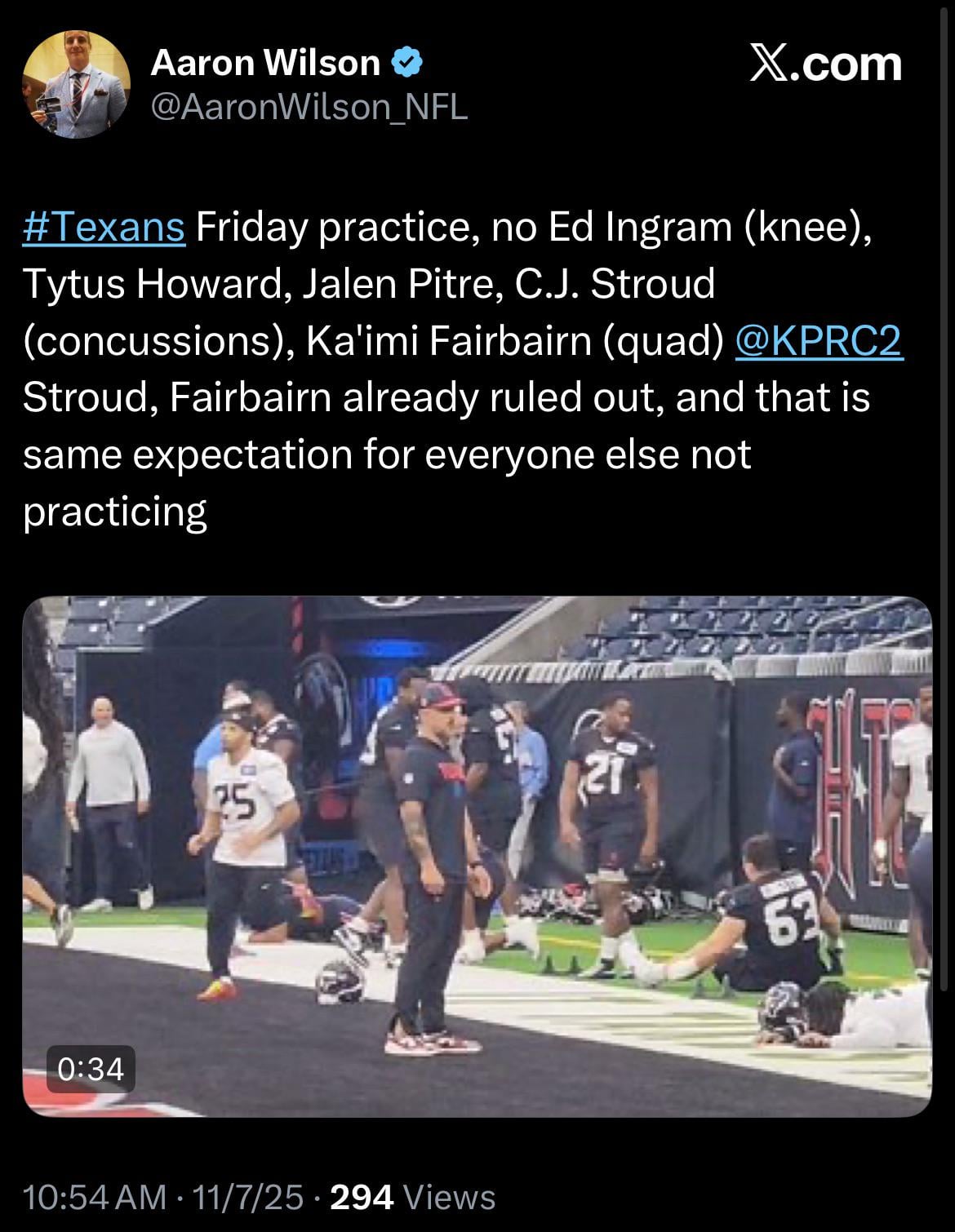 1. Honestly, it feels like these two teams are fighting over who has less starters available. Texans made it this far without too many injuries, then 11 people hurt in 2 weeks.