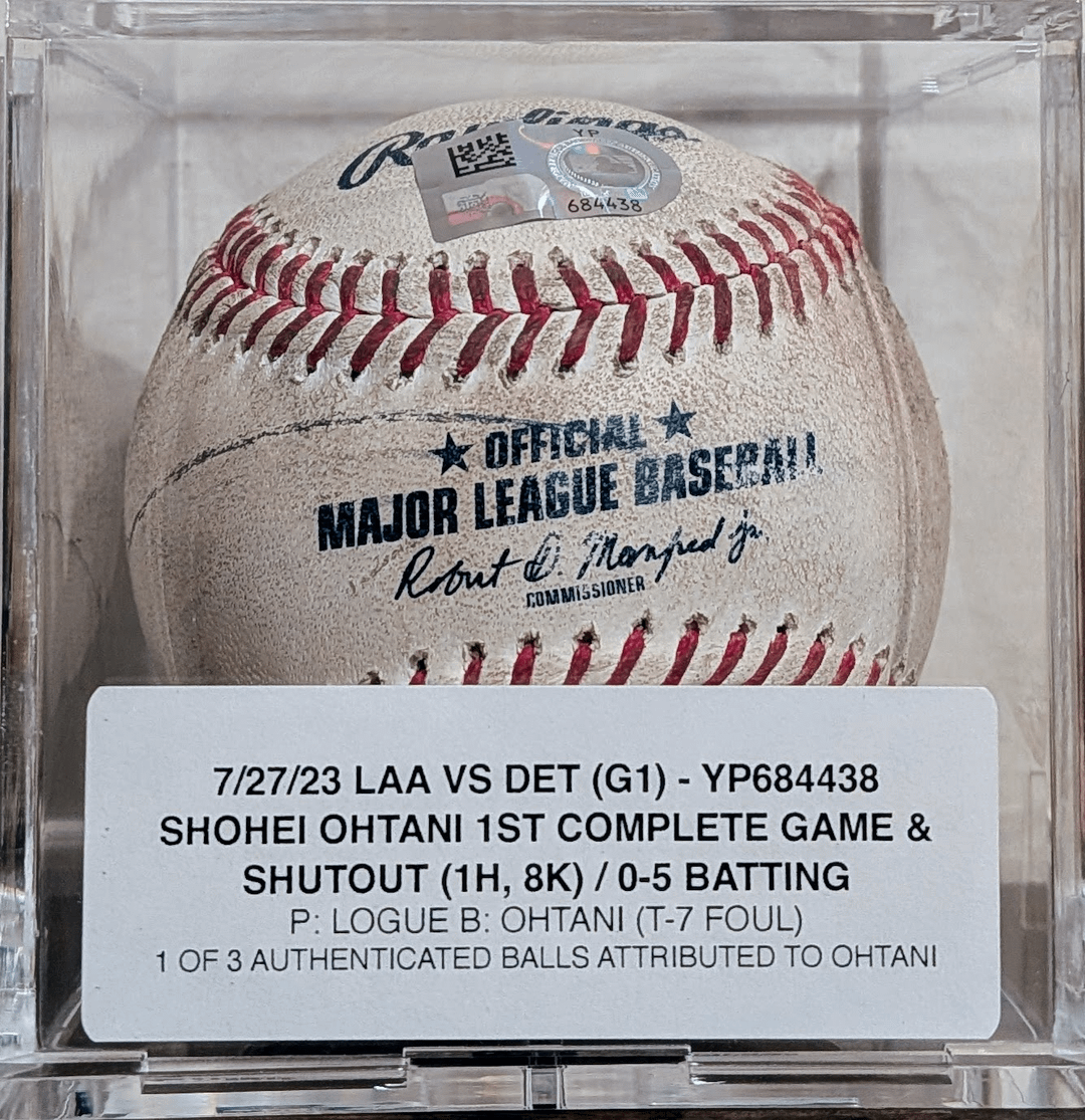 On July 27th 2023, Shohei Ohtani threw his 1st ever career complete game, shutout 1H 8K. This is an actual authenticated game used baseball attributed to him from the game.